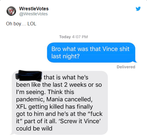 Wrestle Votes поинтересовались у одного из своих источников, что было с Винсом на вчерашнем SmackDown во время поздравления Трипл Эйча с большой датой в карьере и получили следующий ответ: «Приблизительно таким он был в последние 2 недели или около того. Думаю, что эта пандемия, отмена Мании, смерть XFL задели его, и его настроение после всего этого можно описать словами "да пошло всё это". Винс в состоянии "к чёрту всё" может быть диким.»