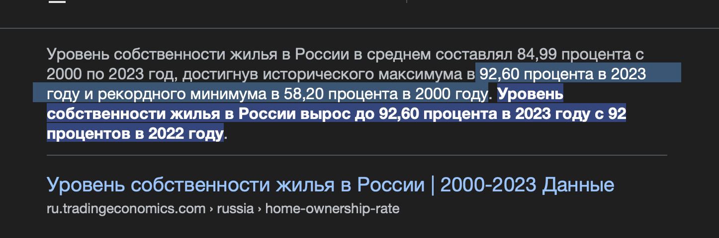 Это всё доли в аварийных микрохрущах. У многих приезжих есть хата в пердюево кукуево, при этом живут они в крупном городе давно. По факту никто не может позволить себе своё нормальное отдельное жилье в крупном городе, для дс нужен стабильный доход минимум 400к, что редкость, все живут по съёмным за 50+к или с родичами.
