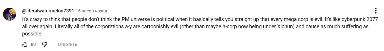 >>6487971 Практически все калпорации чхать хотели на уровень индивидуального благополучия большинства жителей и даже продвижение по лестнице иерархии не спасает от людоедства. Всё крутится вокруг фишки/сингулярности и самопропогации/сохранения, что больше аморально чем откровенно злое. >>6487983 Я и не пытался выдать какого либо тезиса по этим темам. Всё что я сказал, это то что тупость присваивать оценку лицемерия и даунства конкретному человеку в рамках взаимодействия, которое произошло исключительно у анона в голове. >>6487904 Не имеет смысла в современных реалиях статусоублюдии.