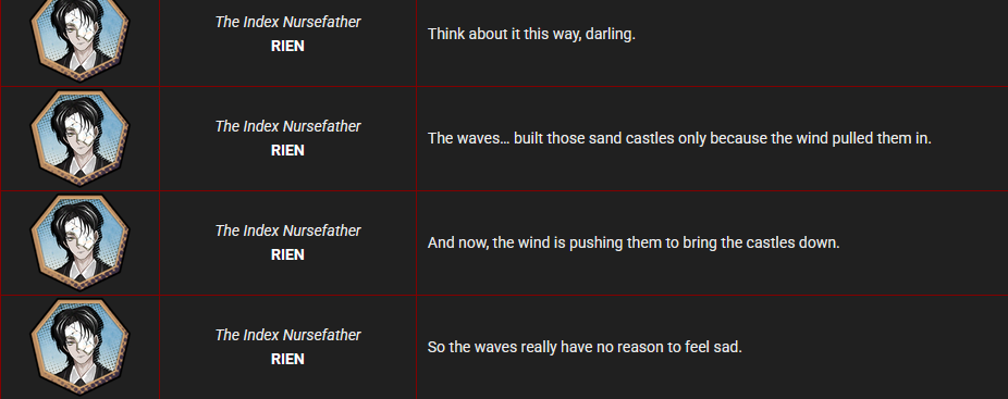 >>6489477 >В каком месте он псих? Его статус эффект - Indulence of Prescript имеет коричневый текст, в котором говорится что он реально кайфовал от всех своих деяний. Тип не я парни убивал и насиловал, эт всё прескрипт. Это нихуя его не оправдывает, но даёт ему кайф ежжи брат творим хуйню виноват другой. Вот типо такой базара пошёл ёпта. По беспределу Риен жил и сдох как пёс, в канаве. Так что стоит задуматься за какого фраера вы мазу тянете, не по людски это всё, людоедская хуйня бля буду.