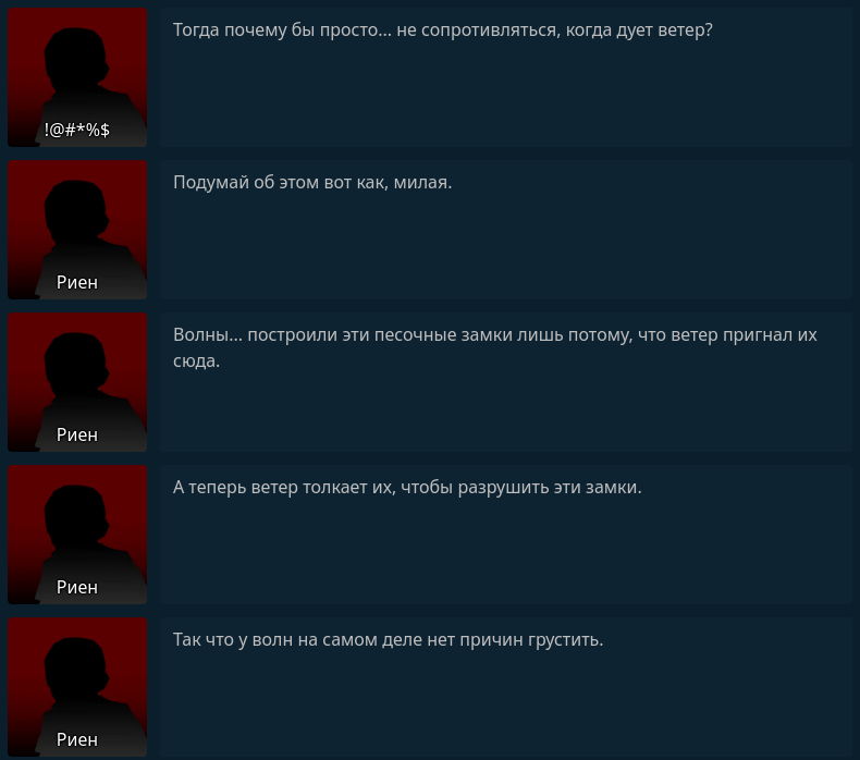 >>6489857 Сколько раз читал этот диалог так и не понял, о каких песочных замках от волн речь идёт? Их же люди делают. Алсо, я хуй знает как ты эту мысль из его слов вычленил, он прямо говорит "Ну мне прескрипт сказал тебя заиметь, сказал смотреть как тебя убивают у меня на глазах, но смысла грустить нет, потому что ты появилась только из за воли прескрипта". О каких нахуй счастливых моментах речь.