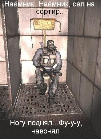 Идет сталкер ночью по Зоне, и тут вдруг видит: старые домики стоят, а в одном из домиков свет горит. Сталкер обрадовался, думает: "Сейчас к своим приду, похаваю, отосплюсь…" Тут глядь, какой-то мужик рядом маячит. Ну сталкер подумал, что это бандит. Подходит к нему тихонько, и за горло удушающим хватает и говорит: - Ну все, козел, молись! И тут этот мужик сдавленным голосом говорит: - Хватит, сталкер! Что уже, нормальному кровососу и отлить негде!?