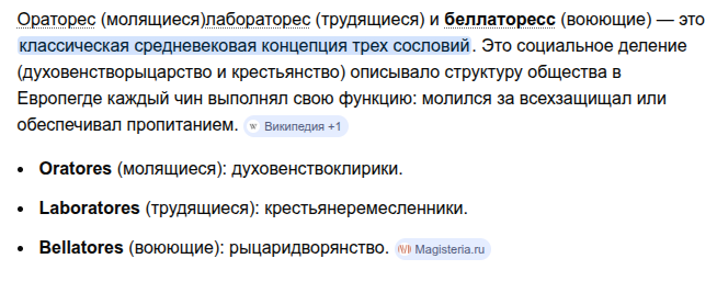 при этом в целом общество делилось на ораторес, лабораторес и беллаторрес ну и раз вспомнили про алхимию, то bellum (война) производит из себя слова: нобелитет, белый, бель (лат.красивый) то есть условно мы все живём (после 30 летней войны и вестфальского мира) в обществе построеном военными, в противовес оттоманскому традиционному обществу иезуитов с резнёй (подрезанием) всех даже не неугодных, а всех ненужных "потом ещё отрастут"/"баобабы ещё нарожают"
