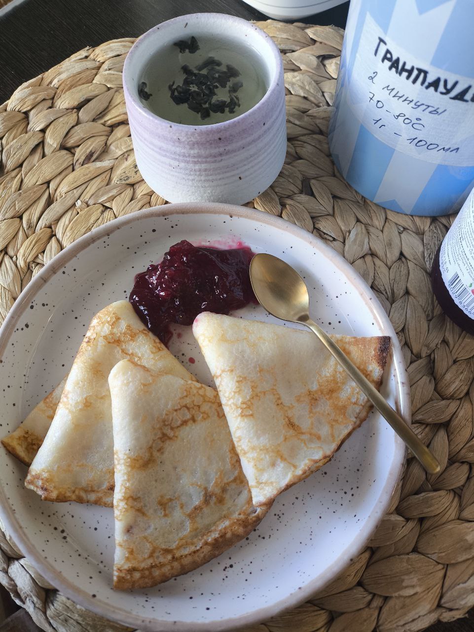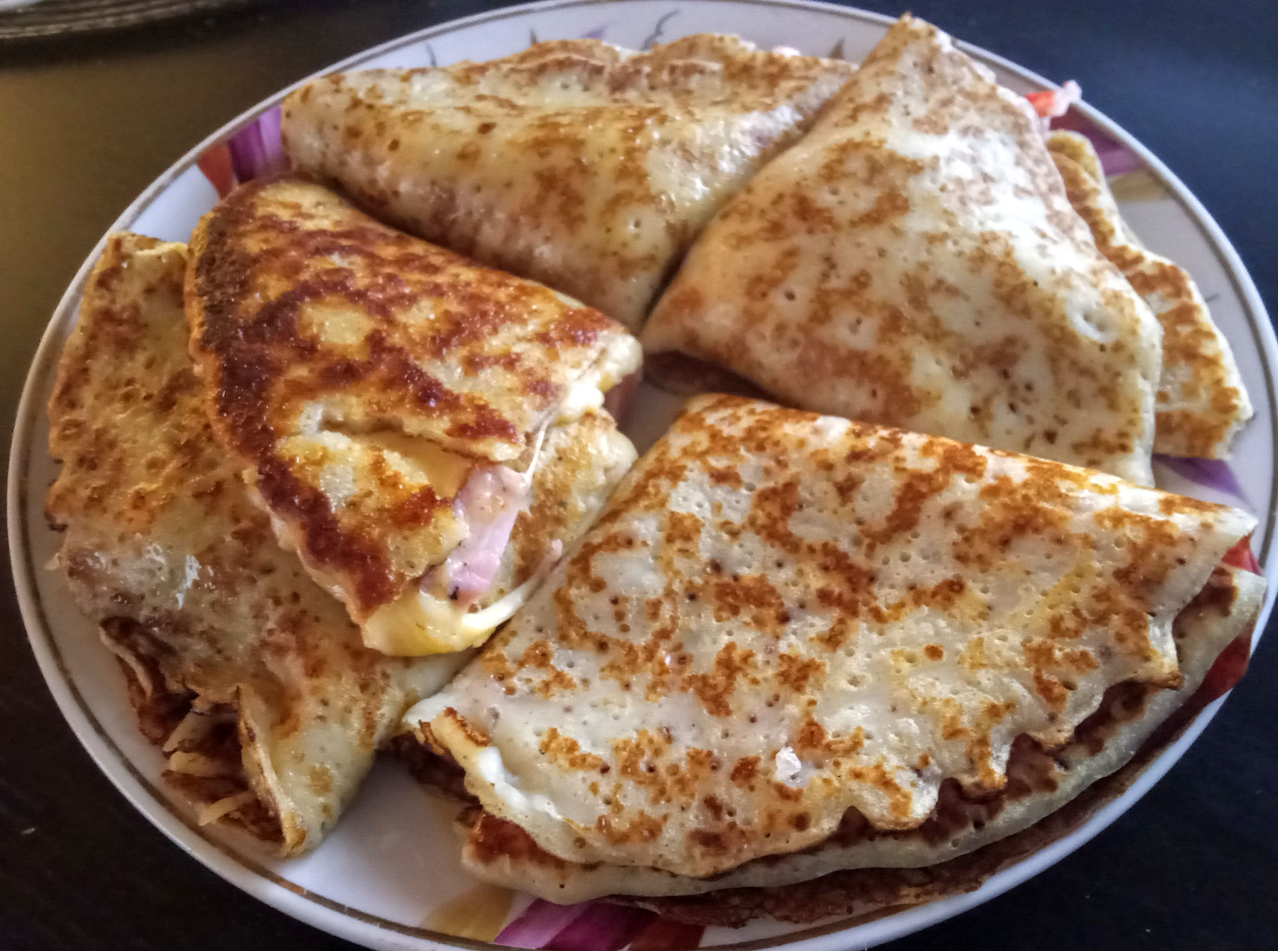Блинцы на обед. Один с сыром и ветчиной, от количества сыра его разорвало немного. Один с клубничным джемом. И два с крабовыми палочками, сливочным маслом и манго соусом.