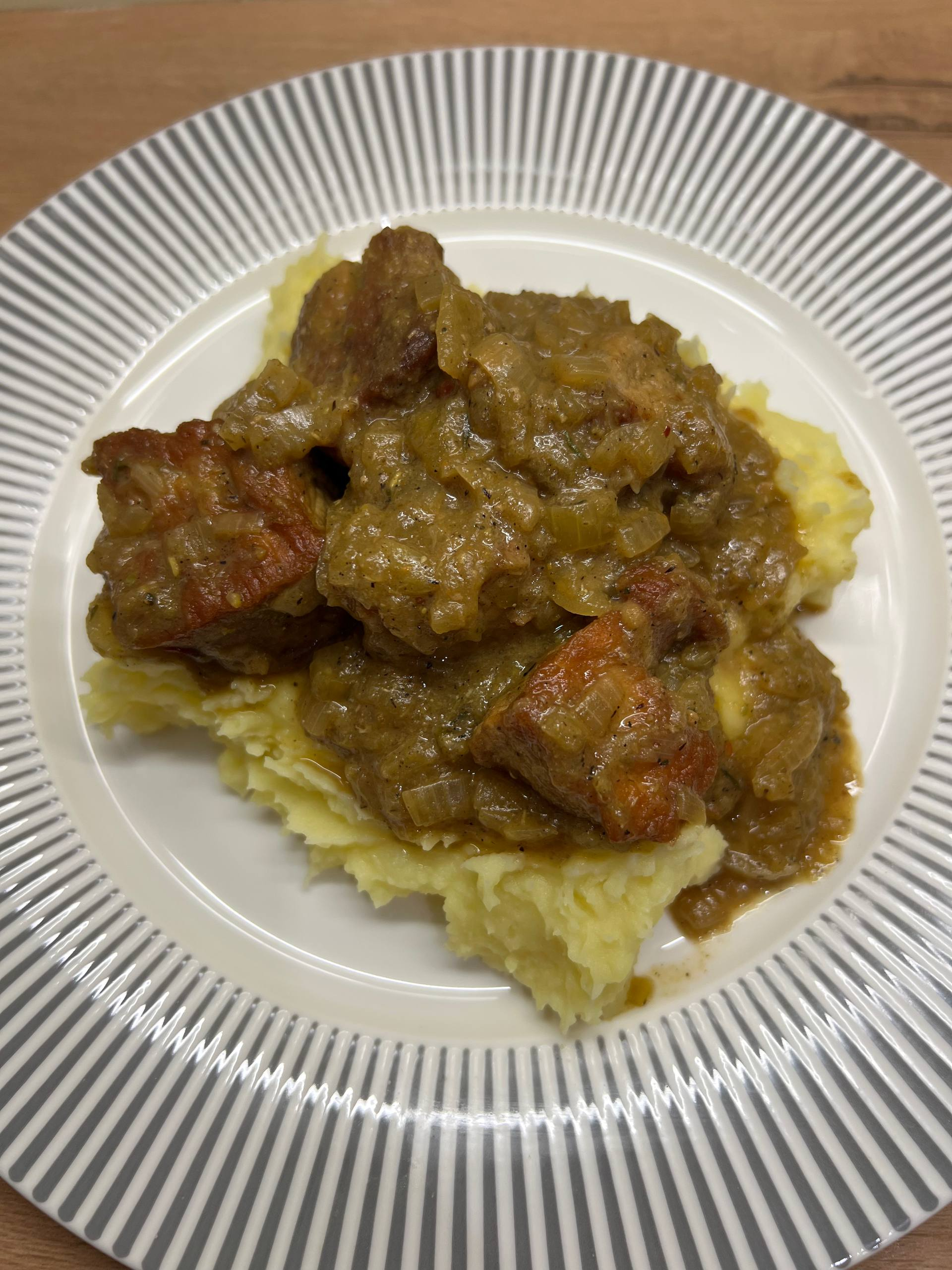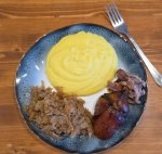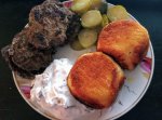 >>766225 В оригинале там должны быть кнедли, но они мне всегда не нравились. Потому заменил на самодельные картофельные котлеты. Они сделаны по принципу драников, где используется смесь толченого вареного картофеля и сырого на мелкой терке. Очень хорошо впитывают соус, выполняя функцию кнедлей.