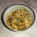Это простецкий салат по сути из трёх ингридиентов, фасоль, лук красный, яблоки, заправлено столовой ложкой рыбного соуса, соевого, яблочного уксуса и масла. На вид может несуразно, по составу может казаться что это не особо то и вкусно, но на деле это пизда как вкусно. Единственное что, в след раз наверное добавлю сельдерея и яблоки руками порежу а не тёркой.