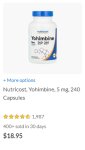 >>1661269 >от йохимбина гидрохлорида из соседней аптеки будет такой же результат Возможно, только на айхербе я возьму 240 капсул со скидкой в 20-30% за 15 баксов или меньше. У посредника курс будет под 100р за доллар, так что выйдет в 1500р. разумеется еще доставка, но я же не один йохимбин буду брать