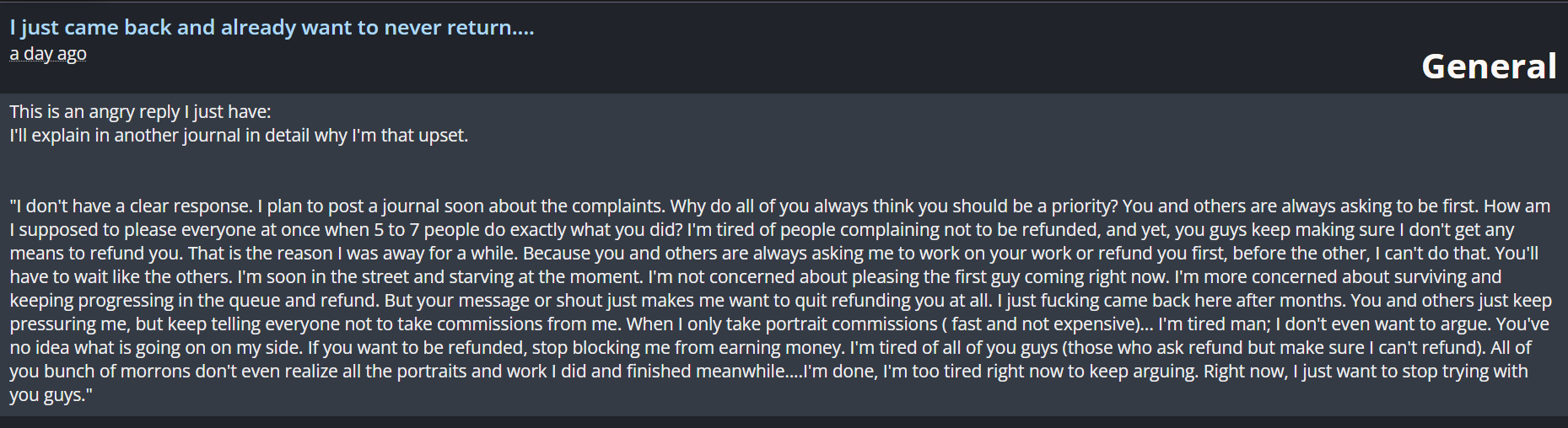 Я не буратина и отлично понимаю, что мои любимки могут не заходить кому-то. Но вы замест того, чтобы это тактично донести "(Мне льстит, чтобы доверили мне свою мечту, но и вы поймите меня: к сожалению, ваш персонаж не пробудил у меня в сердце такого вдохновения, чтобы рисовать его бесплатно"), показав, что вами руководит не только заработок. Это же так сложно да, а не высокомерно молчать или грубить. Когда мне отвечают таким примером, я понимаю, что человек рисует не ради денег, но просто моя идея его не торкнула так, чтобы рисовать её увлечённо, и уважительно с ним прощаюсь. Но вы прям неистовствуете "СЛЫШ, ПЛОТИ!", взрываетесь оскорблениями на вежливое письмо, показываете, что ваш единственный мотив только прибыль и ничего более. Какого вы после этого хотите восприятия и отношения?