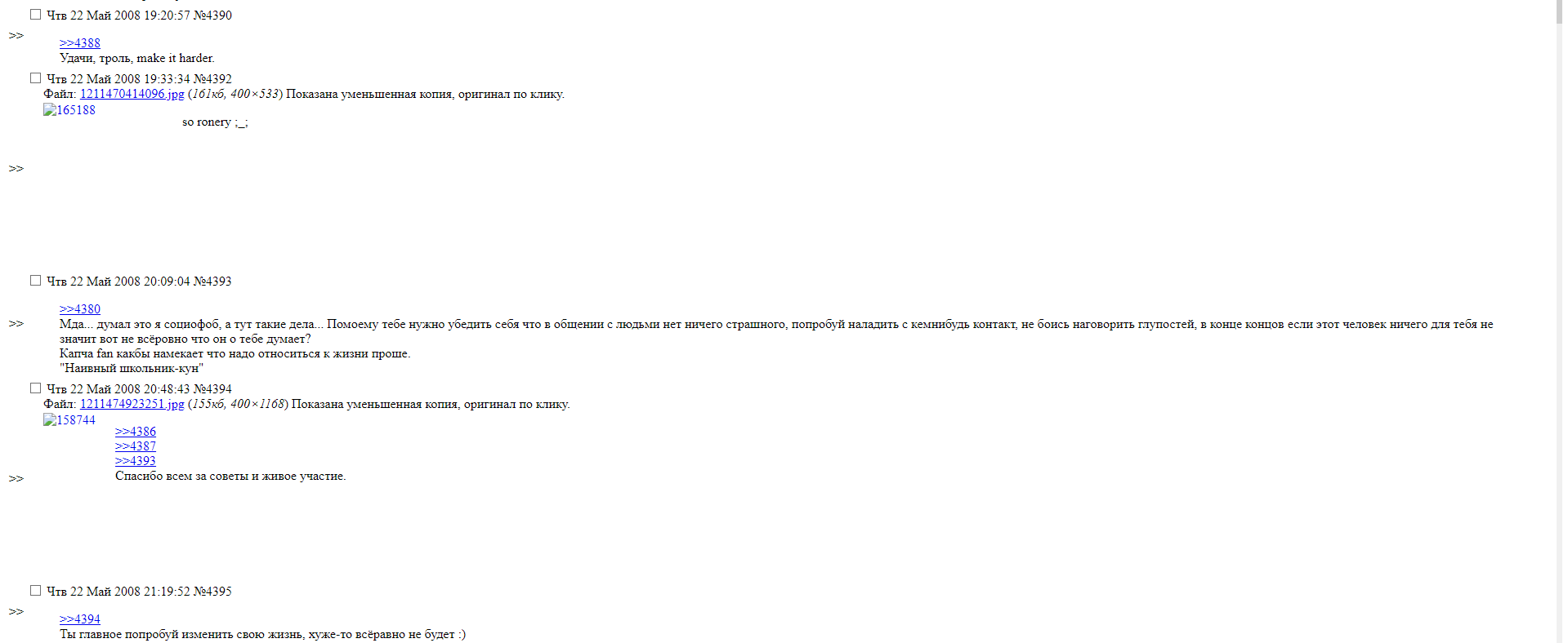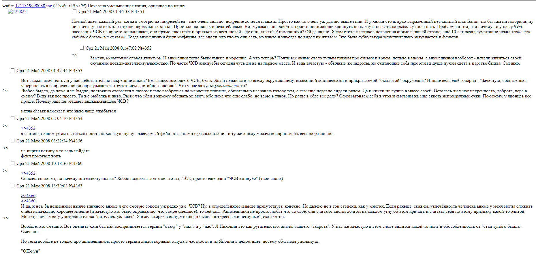 >>330025099 Уже в 2008 году были постеры, которые задавали "местным хикканам" неудобные вопросы: > Ваше элитарство не лишь зависть от отсутствия? > В Японии настоящие хикки которые добровольно встали на путь хикк, хотя могут жить и нормально, а в рахе одни ресентиметарные ублюдки. Почему так?