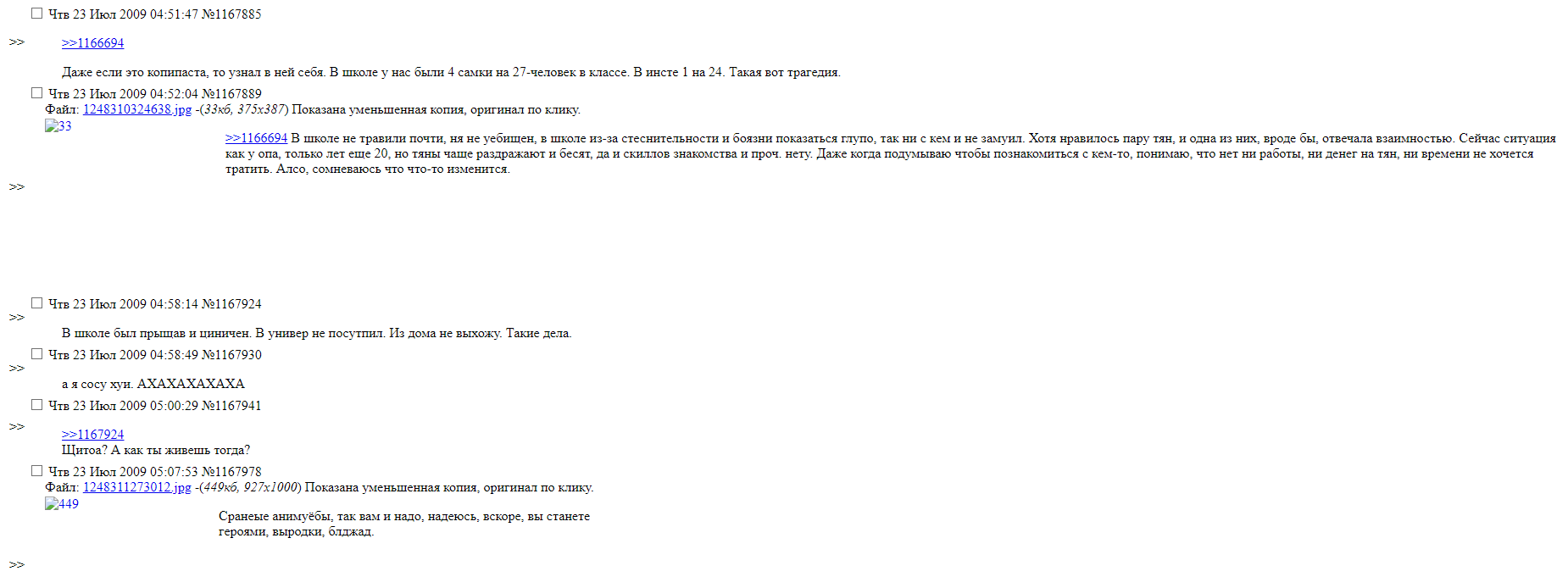 >>330025215 Уже в 2009 году к анонам обязательно приходил тот самый чел, который высирал наиболее мерзкую хуйню, типа "Знаете, аноны-социофобы и сычи, я вам завидую. Сидите на шее у мамки, преодолеваете мелкие проблемы, воспринимая их непродолимой горой. А я уже в 23 три раза женат, для меня вся эта романтика давно уже ушла. Эх, завидую я вам и вашим мелким проблемам долбаебиков))))".