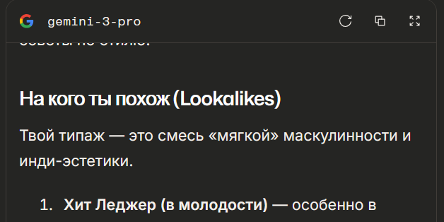 >>330020322 Я не сохранял, делал через режим инкогнито. Там ничего интересного, просто моя фотка с накрашенными губами и подкрашенными глазками:3. Попросил у гпт и гемени оценить мое лицо, и дать советы по улучшению внешности, на удивление получилось очень даже не плохо. >Также можешь скормить своё фото той же gemini и спросить, на кого из известных людей ты наиболее похож, что не так с внешкой и что можно поправить. Сейчас попробую