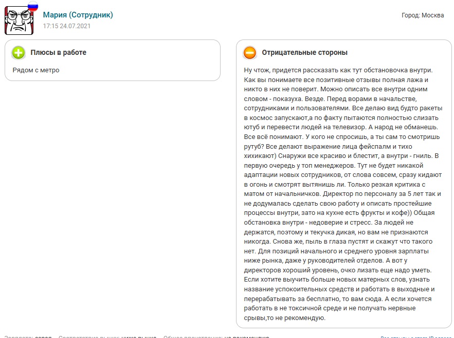Если вы надеетесь устроиться в штат Rutube, то вы попали точно по адресу. Специалисты из Днепра уже релоцировались в офис Руформа и в открытую промышляют добычей ваших данных. Схема ювелирная, выставляется на всех сайтах типа HH.ru вакансия «модератор видеоконтента», которая весит годами, и далее дурачок ведётся, конторка то не мутная на первый взгляд, это же наш отечественный ответ Обэмэ, и скидывает своё резюме. Ему предлагают пройти небольшое задание и затем ещё не оформляя в штат с него требуют целый пакет документов (сканы паспорта, военного билета, СНИЛСа, трудовой книжки, диплома об образовании), якобы для проверки службой безопасности. Попахивает мошенниками? Да вы что!? Нет!! Не может быть! Разумеется всё заканчивается отфутболиванием потенциального кандидата спустя 1.5 месяца ожиданий и снова по кругу. По отзывам тех кто столкнулся с этим это не явно единичные случаи.