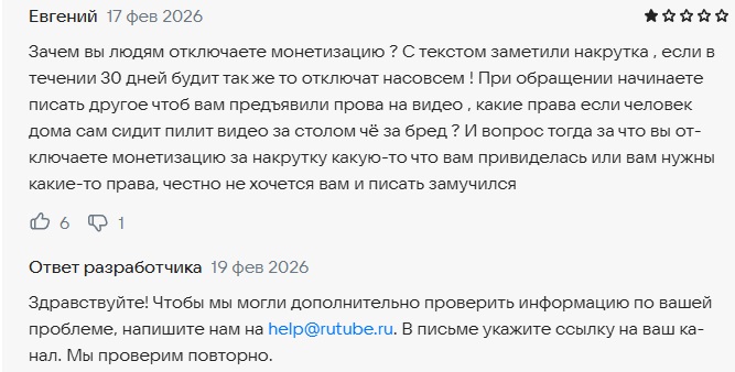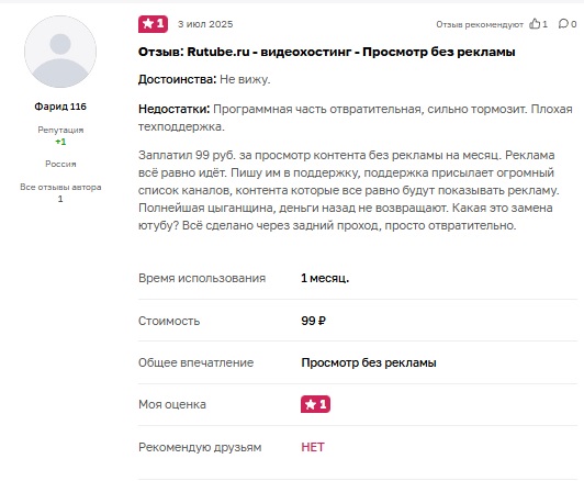 Золотое правило компании – если деньги попали в нашу кассу, то это теперь наши деньги. Большинство отзывов тех любителей битвы экстрасенсов, что залетели в этот филиал ТНТ, связана с ебейшим засилием рекламы. Жмоты из Рутуба в двух минутный ролик вставляют по 5, а то и более рекламных видеороликов (Если это не отмывочная прокладка, то я уж не знаю нахуя так делать) и постоянно попрошайничают с оформлением подписки для отключения этой самой рекламы. Дяденька, а дяденька? Купи кирпич. Чтобы стать персональной статусной сучкой этого выкидыша импортозамещения вам потребуется заплатить всего то 99 рублей в месяц. Небольшие деньги, согласись, анончик? Почему бы и не оформить её? Но и тут тебя опрокидывают и впаривают по полной рекламу. Как же так? Я же заплатил. Анон бежит в техподдержку и требуют вернуть свои деньги, но они врубают тотальнейший игнор и продолжают списывать с твоего кошелька. Не получается и тогда анон бежит уже в отзывы под гугл плей и там ему поддержка Rutube, чтобы отключить рекламу, предлагает… ВНИМАНИЕ!! ЗАДЕРЖИТЕ ДЫХАНИЕ!!!... предлагает купить ЕЩЁ ОДНУ ПОДПИСКУ!!! Вы тоже в ахуе с этих выкидонов, да? С владельцами некоторых каналов на рутубе та же история, им подключают монетизацию и когда они набрали нужную сумму для вывода средств и им жалкие 3к рублей и то зажимают.