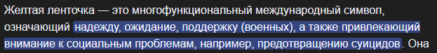 >>330003816 >Ленточки могли означать что-то другое, поэтому смешно Ну я как бы это знаю. Я имел в виду, что хочу, чтобы мне объяснили, что конкретно означает жёлтая ленточка, причём общепринятое значение, чтобы почти любому понятно было.