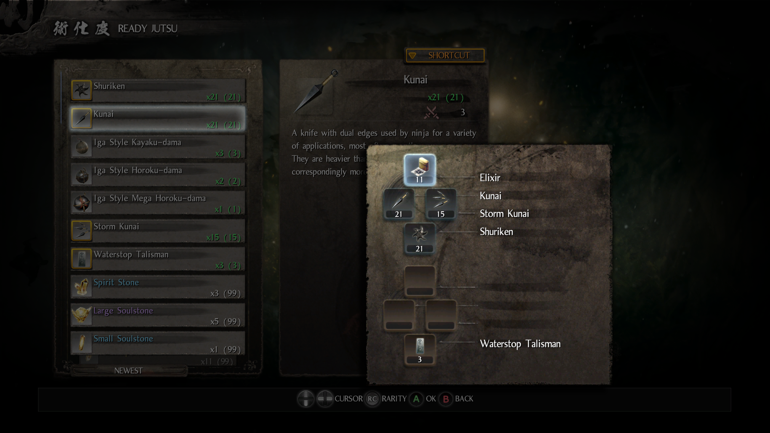 Я всю игру прошел с 7 кунаями, 7 сюрикенами и 5 кунай штормами. Оказывается можно было их сделать в 3 раза больше. Если б я знал, я б за всю игру вообще ни разу не сдох наверное.