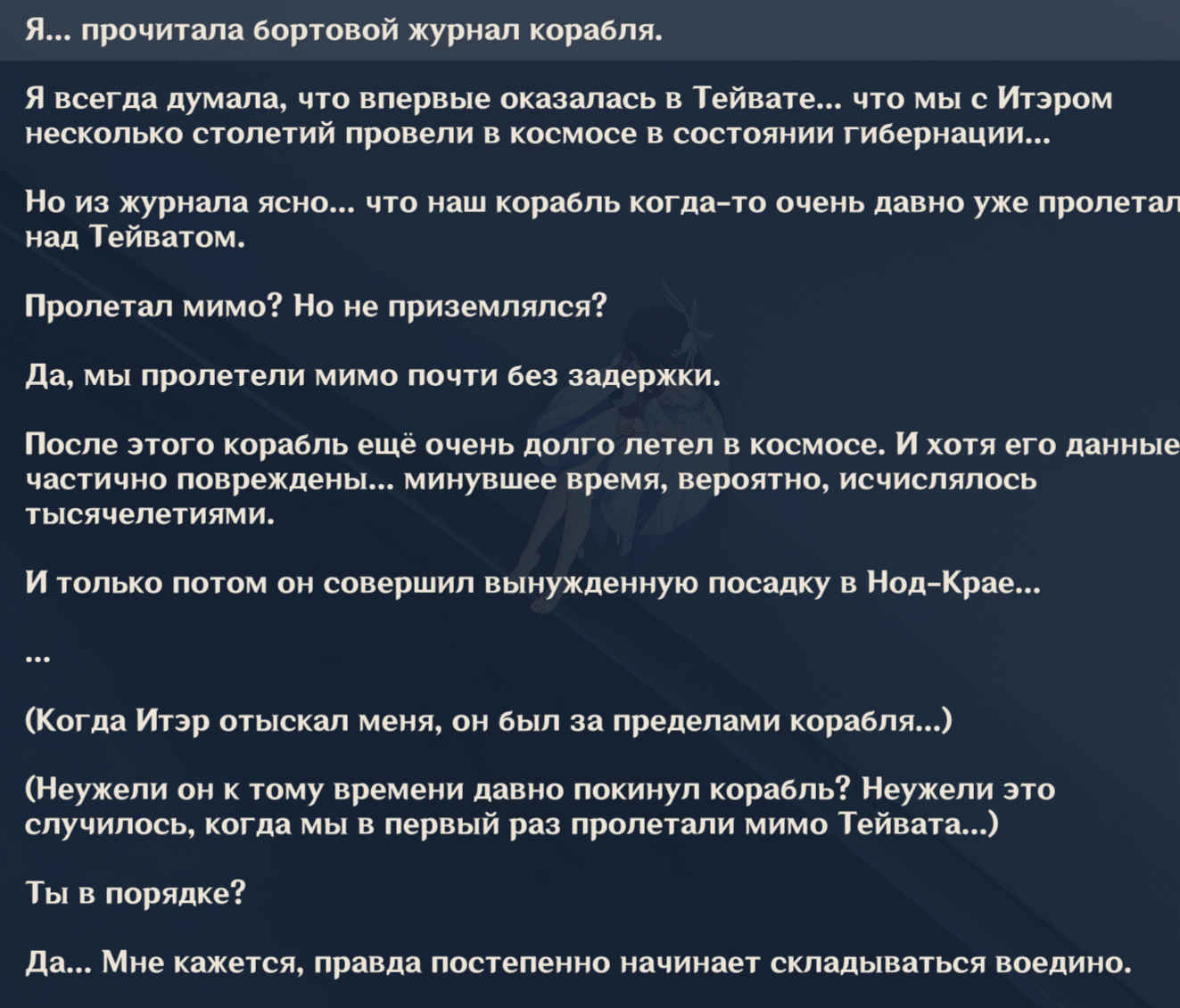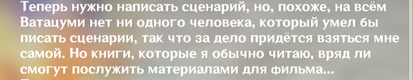 >>6460829 Ахуеть! Ты не поверишь, но в крайней сюжетке Нод-Края я тоже обратил внимания на диалог Флинса, Нефер и Паймон, когда они лунное послание от Колумбины искали. И тоже так в журнале диалогов тыкал на разные реплики, в начале которых были стоны. Их там очень много оказалось и они весьма кучно стояли. Я так игрался несколько минут, хихикал как дурной и у меня была даже мысль, записать это, а потом в тред выложить. Но передумал, лень стало, да и подумали бы, что я шиз какой-то... Но теперь жалею, блин. Как было бы круто, если бы я это сделал и сейчас тебе ответную шебмку кинул. Эхх.