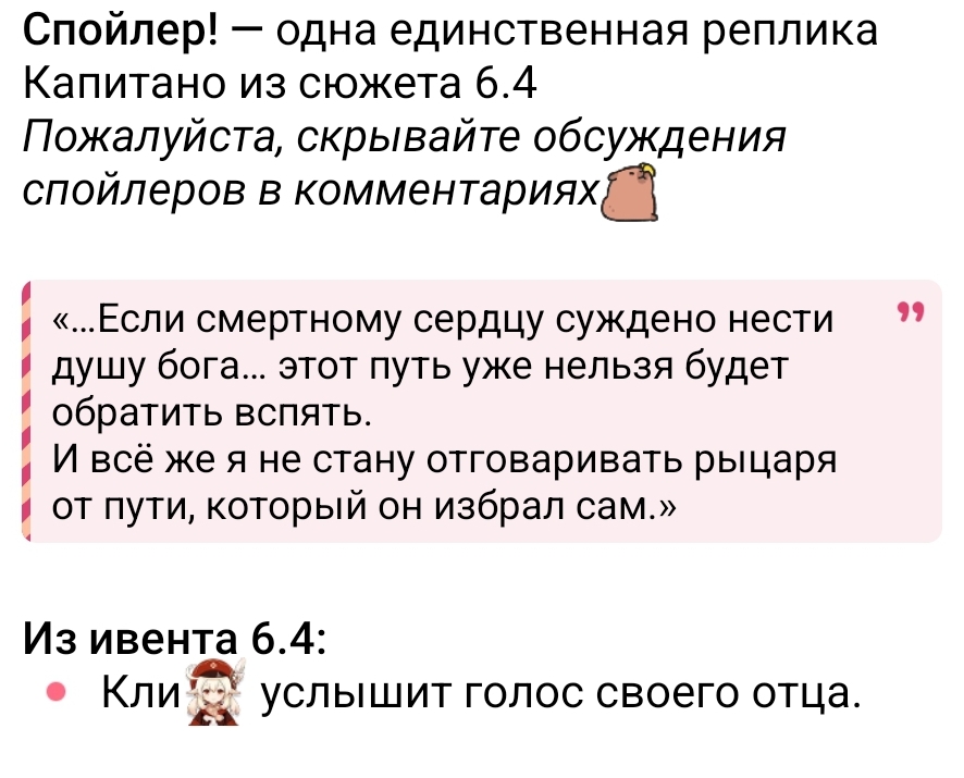 Но по итогу в образ ангела у нас почти идеально вписывается Лошадь, разве что опять же без жутких замашек, а Клумба это максимально скучный и унылый кал, на фоне которого даже Аяка кажется верхом прописанности. И самое обидное, ради её продажи Ляо закопал остальных Предвестников и низвёл их в мусорку. Поэтому я ненавижу этого персонажа всем сердцем. У неё был огромный потенциал стать интересной и запоминающкйся, но она стала региональной милой доброй аутичной невинной вайфу, каких в игре и так дохуя.