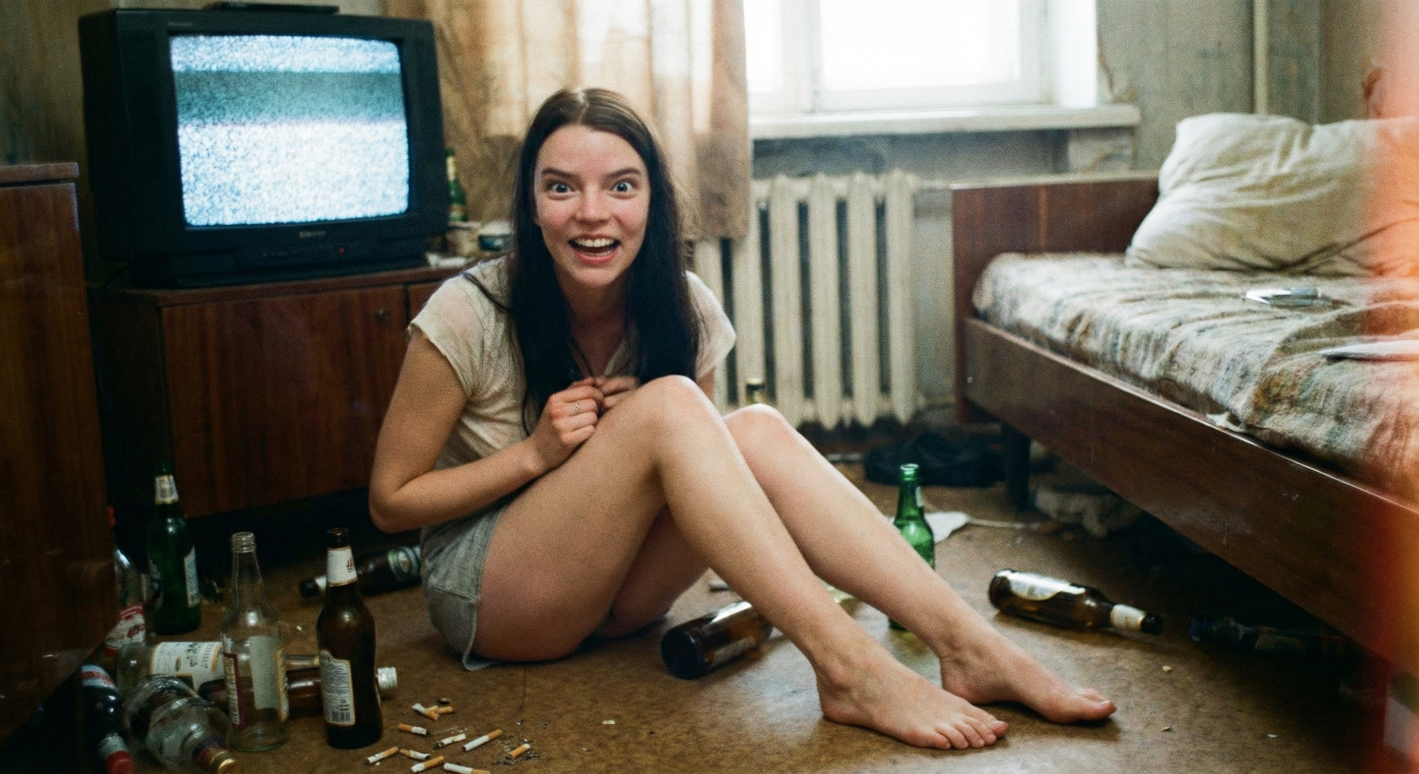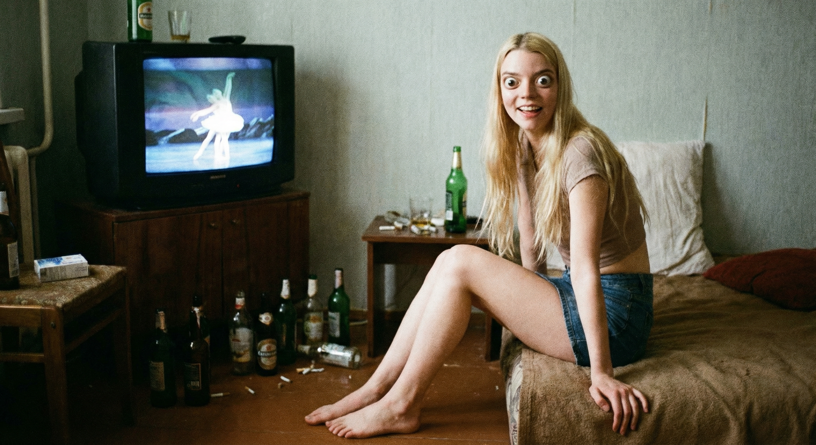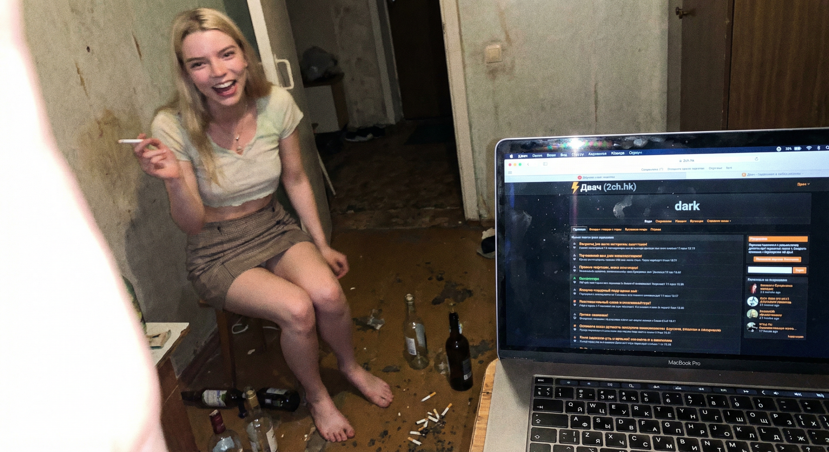 аня тейлор-джой (та самая из «хода королевы» и «фуриосы») которую нано банана засунула в твой родной ареал обитания — в обоссанную хрущевку к битарду-алкашу. на экране ноута открыта главная страница харкача вокруг горы мусора бычки и дешевое пойло.
