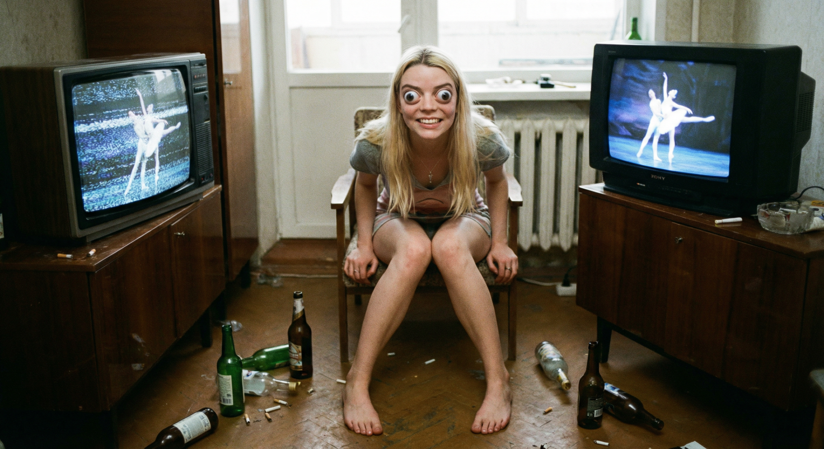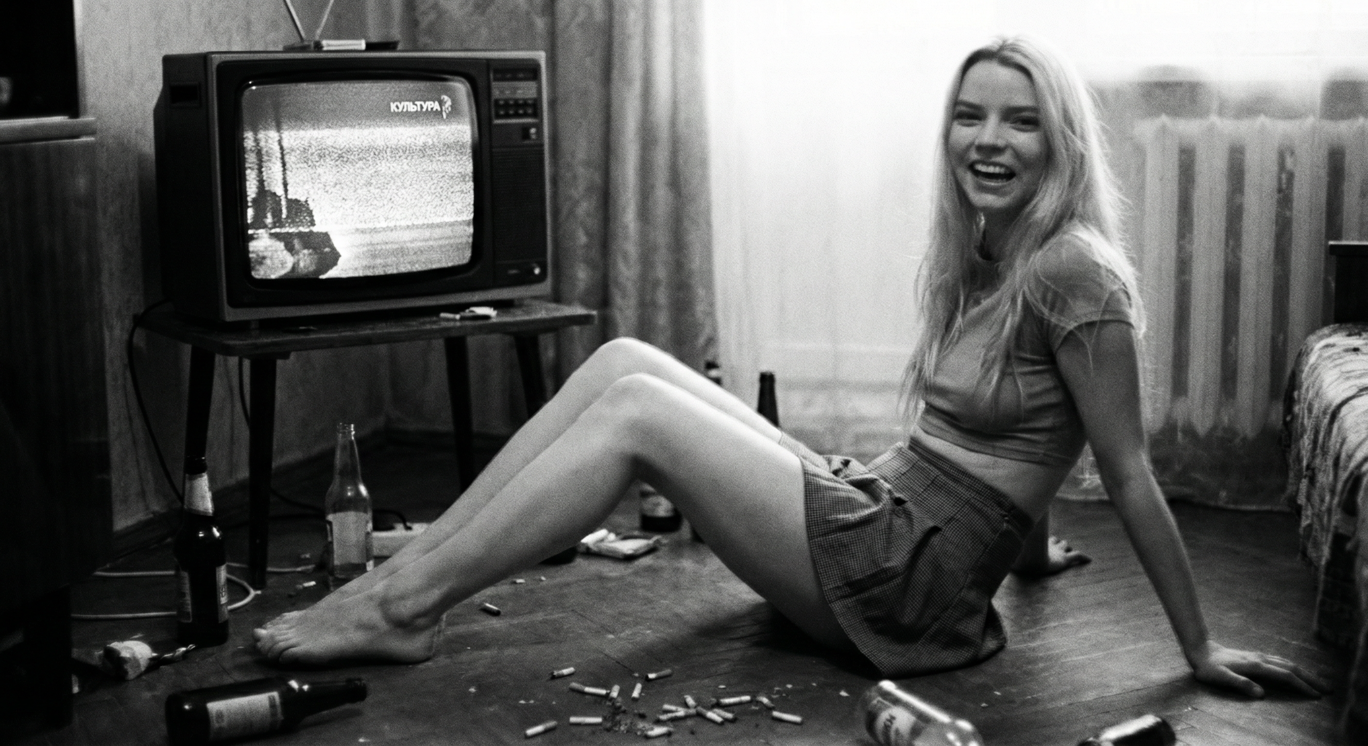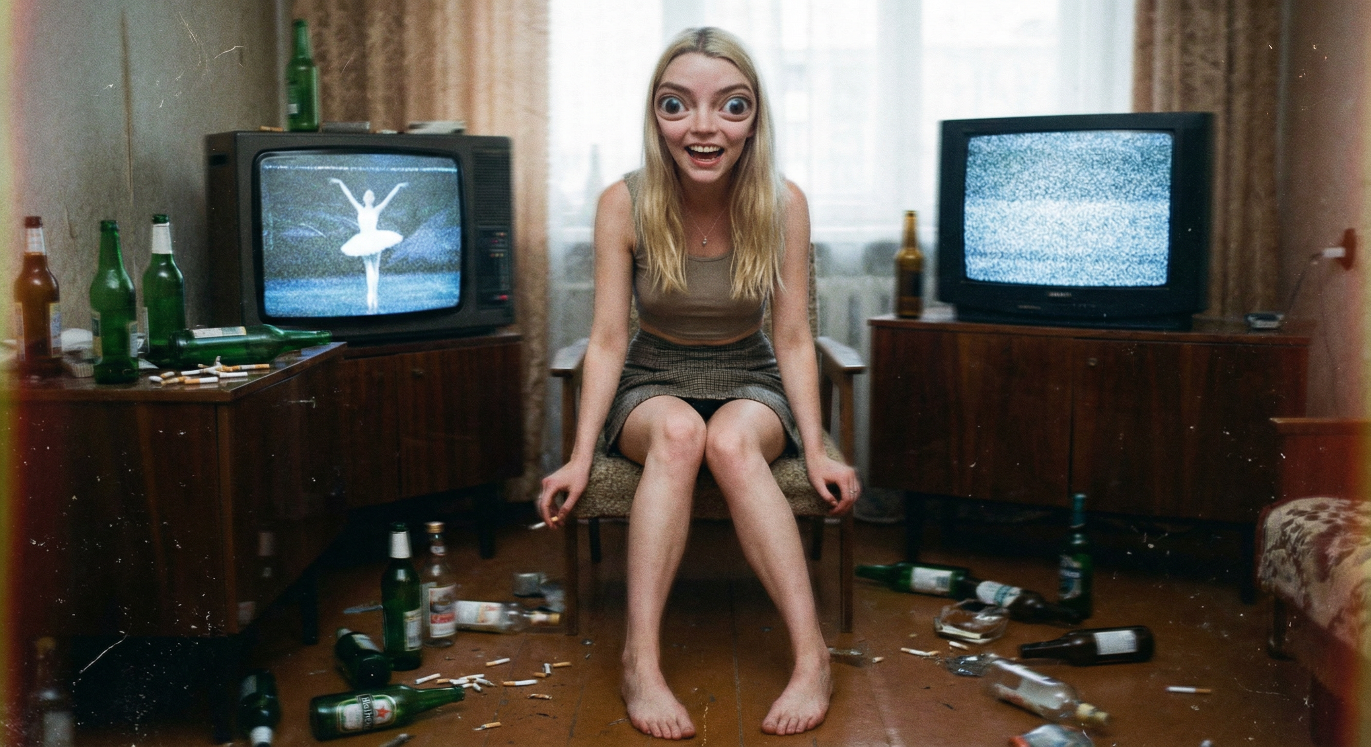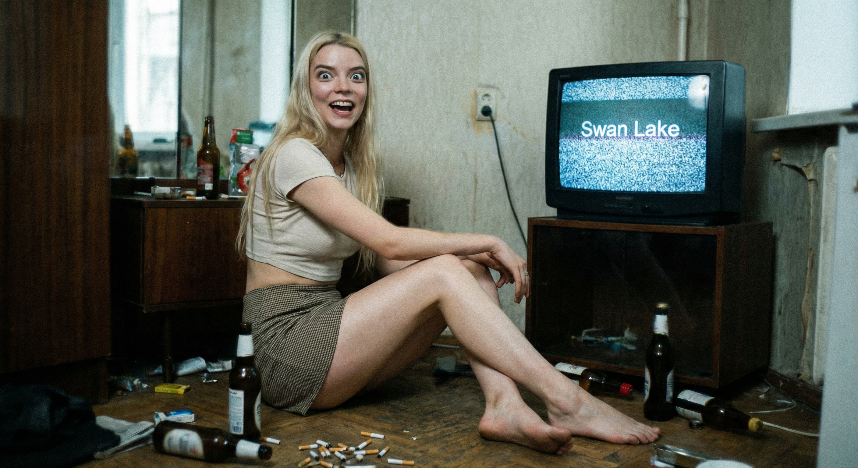 аня тейлор-джой (та самая из «хода королевы» и «фуриосы») которую нано банана засунула в твой родной ареал обитания — в обоссанную хрущевку к битарду-алкашу. на экране ноута открыта главная страница харкача вокруг горы мусора бычки и дешевое пойло.