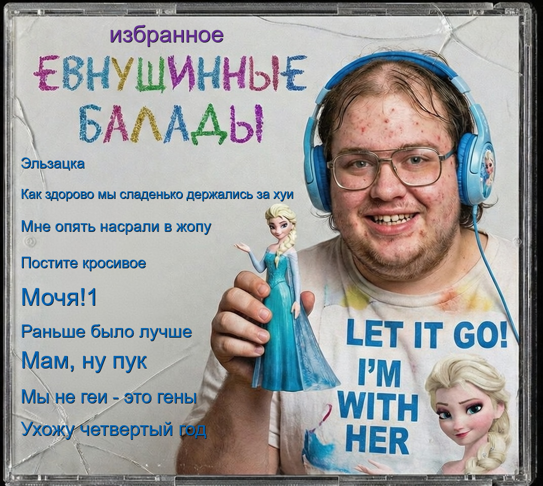 Это квинтэссенция типичного двачера-омежки, сыча и инцела в одном флаконе. это обложка воображаемого диска «евнушиные балады» (орфография для таких дегенератов как ты сохранена). на переднем плане — жирный прыщавый боров с ебалом не обремененным интеллектом, который вцепился в фигурку эльзы как в последний шанс потерять девственность хотя бы в воображении.