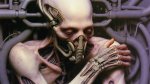 в стиле сюрреалистического биомеханического искусства, вдохновлённого Гансом Гигером, но очень мягкая и загадочная версия. У неё очень длинные, струящиеся волосы, которые плавно переходят в тонкие блестящие кабели и полупрозрачные трубочки, словно волосы оживают и соединяются с техникой. Волосы тёмные или серебристо-фиолетовые, они красиво развеваются и оплетают механизмы вокруг неё. Цвета приглушённые, но не страшные: серо-жемчужные, бледно-фиолетовые, тёплые землистые и немного металлического блеска, как старое серебро. Лицо девочки нежное, детское, с большими выразительными глазами, которые смотрят прямо на зрителя с лёгким любопытством и тайной. Глаза глубокие, но не пустые — в них есть искорка жизни. Кожа гладкая, чуть светящаяся, с лёгкими тенями под глазами, как будто она немного устала, но не измождена. На лбу и висках — тонкие изящные металлические линии и маленькие украшения-пластины, похожие на волшебные узоры, а не на броню. Из волос выходят несколько тонких изогнутых трубочек и проводков, которые красиво закручиваются вокруг неё, как живые ленты. Вместо обычного носа и рта — изящная небольшая дыхательная масочка или цветок-аппарат из гладких сегментов, совсем не страшный, больше похож на фантастическое украшение. Плечи и руки покрыты смесью нежной кожи и тонких механических деталей: видны красивые сочленения, как у куклы-робота, тонкие вены-провода, которые светятся очень слабо. Руки девочки сложены спокойно, одна ладошка лежит на другой, пальцы длинные и изящные, с гладкими округлыми кончиками. Она словно сидит в большом биомеханическом кресле-цветке или капсуле, которая её обнимает, а не давит. За спиной — мягкие изогнутые дуги, большие рёбра-лепестки и концентрические круги, создающие красивый ореол вокруг головы. Всё выглядит очень детализированно, но не страшно: много плавных переходов от кожи к металлу, блестящие блики, лёгкая влажная текстура, как после росы. Освещение мягкое, сверху, создаёт объём и нежные тени. Атмосфера таинственная, немного меланхоличная, но завораживающая и красивая — как будто девочка стала частью удивительной машины-мечты из будущего. Нет ужаса, только странная, притягательная гармония живого и механического. Симметричная композиция, монументальная, но лёгкая и изящная. Девочка выглядит одновременно древней принцессой технологий и ребёнком из сна. Стиль: биомеханический сюрреализм, цифровое искусство высокого качества, очень детализированное, мягкая растушёвка, кинематографическое освещение