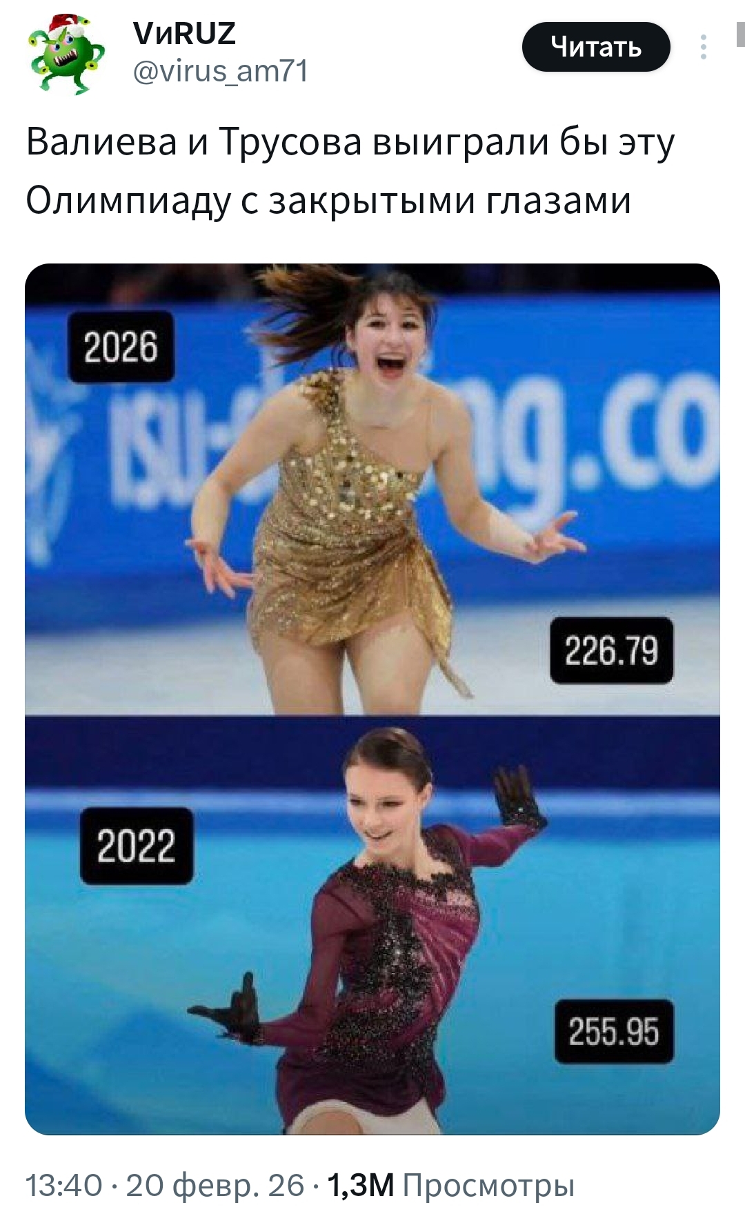 22-летняя жирная корова Кейтлин Осмонд в 2018 году набрала 231 балл на ОИ. 20-летняя Алису Лю в 2026 году набрала 226 баллов, т.е. на 5 баллов меньше. Почему так? Неужели более молодая фигуристка и с явно меньшим весом в 2026 году не может набрать хотя бы 230+ баллов?