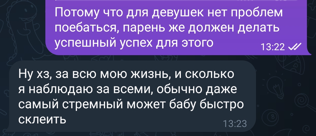 вот у них картина мира такая что у мужиков также, мол по 10 блядей в день пишут и мужику только ширинкой звякнуть и уже склеил бабу