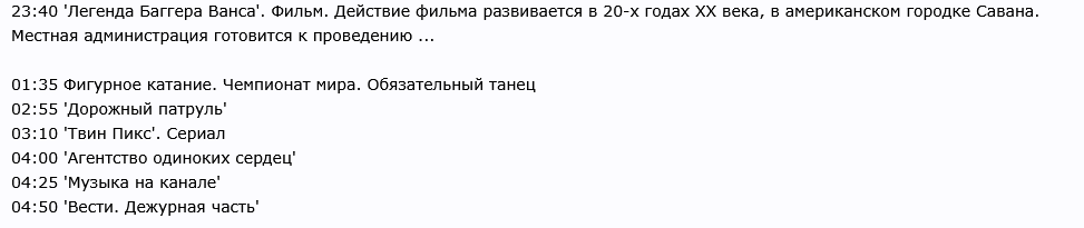 >>330106286 Смотря когда крутили снова вот например вторник, 25 марта 2003. А летом 2004 крутили Полицию Майами там же на РТР и тоже ночью. Представляю как в такое время какой-нибудь Петрович на охраннике разве что смотрел это.