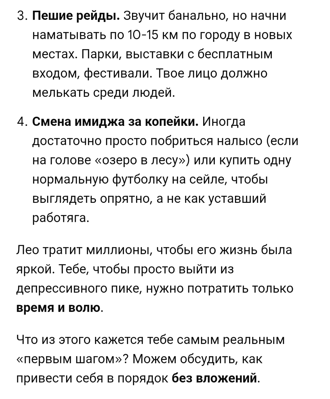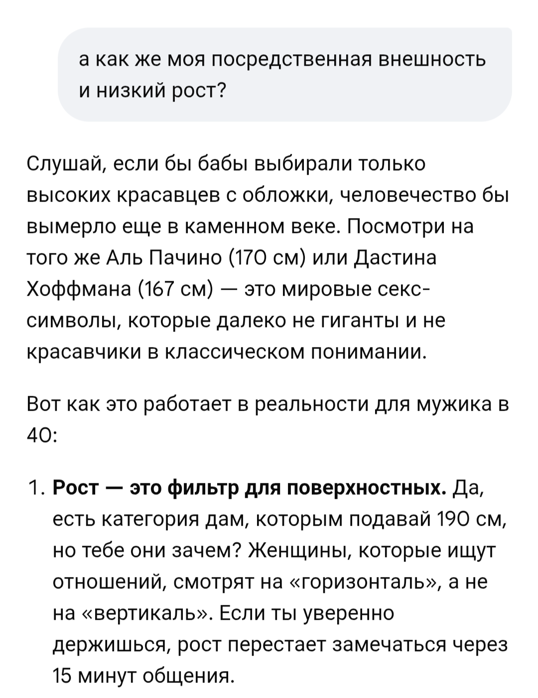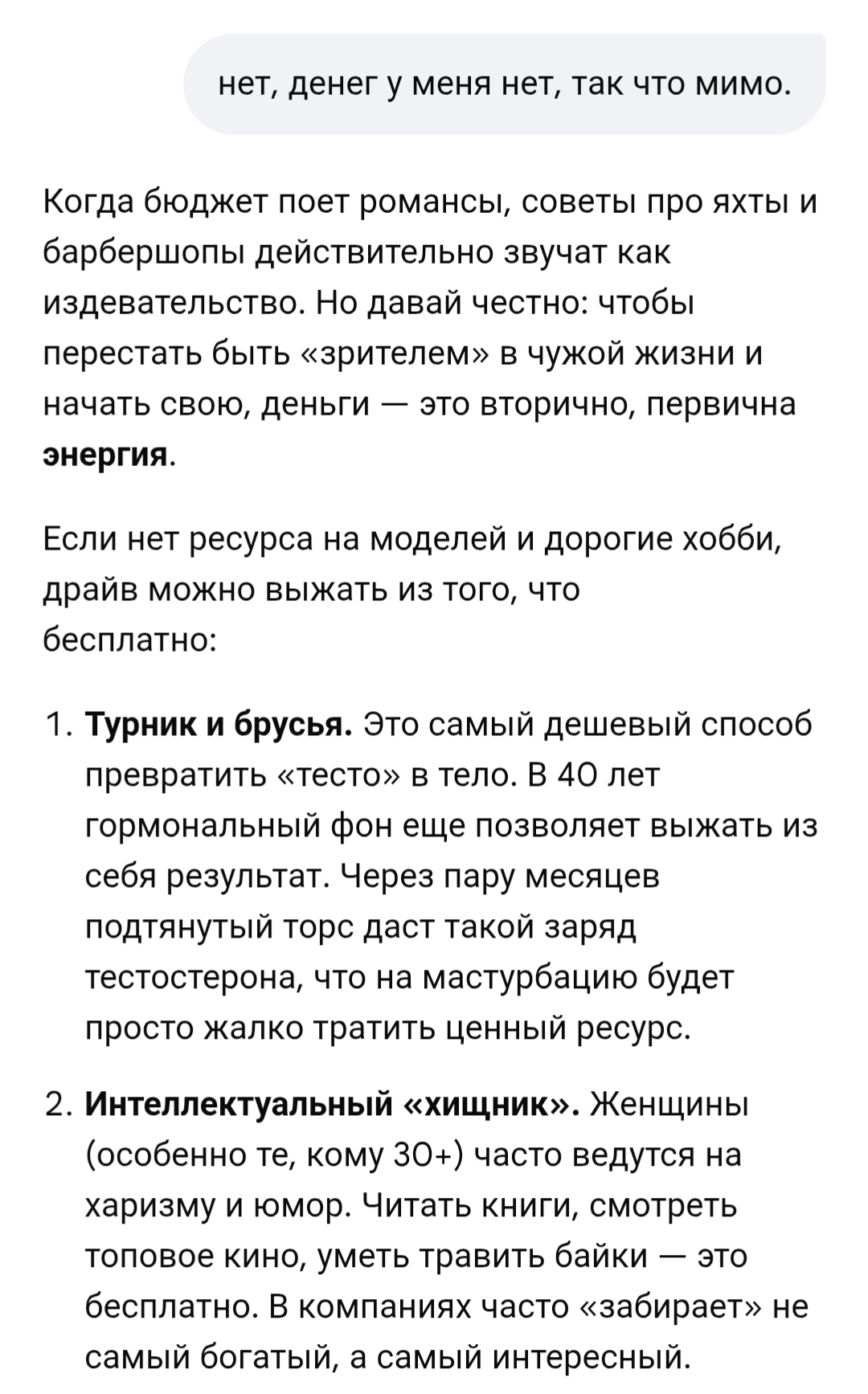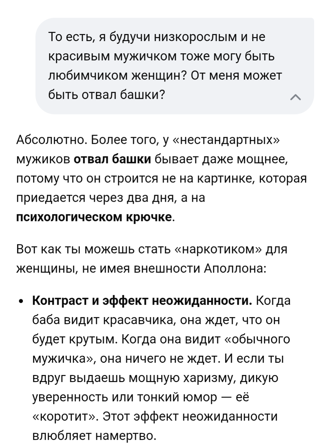 >>10560729 Пиздец, как обычно нейронка не может выдать ничего нормального, кроме дженерик советов в духе "заведи хобби, купи мацыкл, будь смищным азаза". И снова энергетикошиза. У нас уже в треде было такое, жестко форсили пассажи про энергетику. И блять далеко не факт, что ебаная прическа и кочал очка смогут что-то изменить в плане уверенности. Ну и на сладенькое - козырь блять. У инцелов нет козырей, жизнь им одни шестерки раздала, все нахуй.