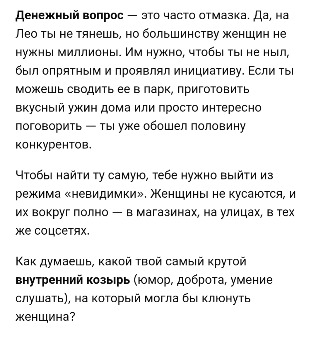 >>10560729 Как тян, забревшая сюда ( не от слова бревно), скажу что реально годные советы, 70-80 % женщин в 30—35 лет уже не выебываются и будут течь от мужика, если он не ноет как тварь, не ссытся в постель, работает и не выглядит как задроченный чухан. «Принцесс» в таком возрасте уже мало, но не позволяй им самооценку тебе портить. Кстати, если хоть какое-то хобби есть, то просто заебись. А долбаебы, которые так и будут ныть из-за нежелания хоть жопу поднять с проперженного стула, так и будут дрочить.
