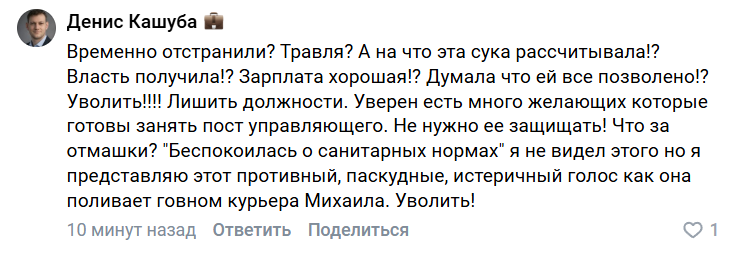 Вы готовы? Воздуха набрали? Задние ряды уже поняли. Предыдущую управляющую, Анастасию Черкасову, уволили за то, что она отказалась выгонять собаку. То есть выгнать блоховоза это была инициатива руководства, а из новой управляющей сделали козла отпущения.