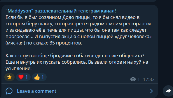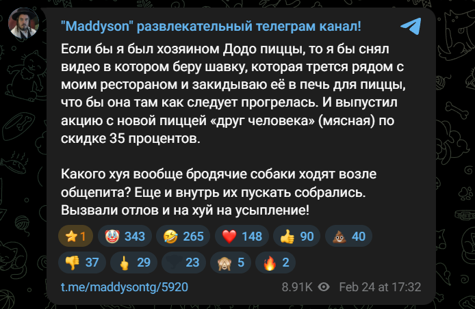 Если бы я был хозяином Додо пиццы, то я бы снял видео в котором беру шавку, которая трется рядом с моим рестораном и закидываю её в печь для пиццы, что бы она там как следует прогрелась. И выпустил акцию с новой пиццей «друг человека» (мясная) по скидке 35 процентов.