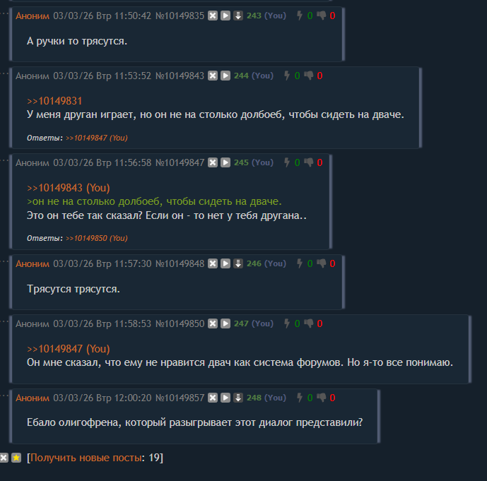 Однако же шиз держит тред на плаву. Причём мне стало интересно, откуда столько сообщений на счётчике с последнего ответа набежало - неужто тут есть чо обсуждать 70 постов.