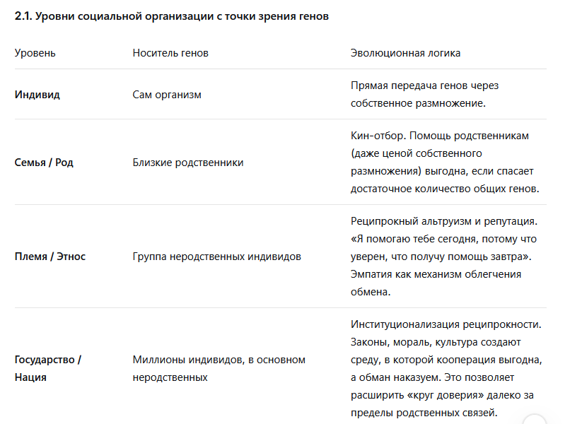 **Вывод для социологии:** Социальные институты эффективны ровно настолько, насколько они позволяют индивидам реализовать свою глубинную эволюционную цель — передачу генов — через кооперацию, минимизируя разрушительные формы внутренней конкуренции.