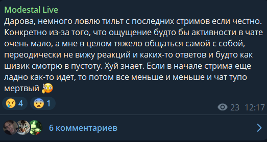 Вы реально этот кал смотрите, или это спящий бизнес на 3к онлайна? Пора менять свой досуг, один хуй стримы дерьмом ебаным стали, не только её. Сегодня отписку прожал, если будет чет интересное в записях гляну. Вот и всё, можно закрыть вкладку твича, ещё одни оковы сброшены.
