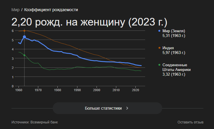 И? В Азии и Африке рождаемость тоже снижается, просто у них это началось лет на 30-40 позже, чем у нас. Общемировая рождаемость уже на уровне простого воспроизводства, а в самой населенной стране мира Индии ниже 2 и продолжает снижаться.