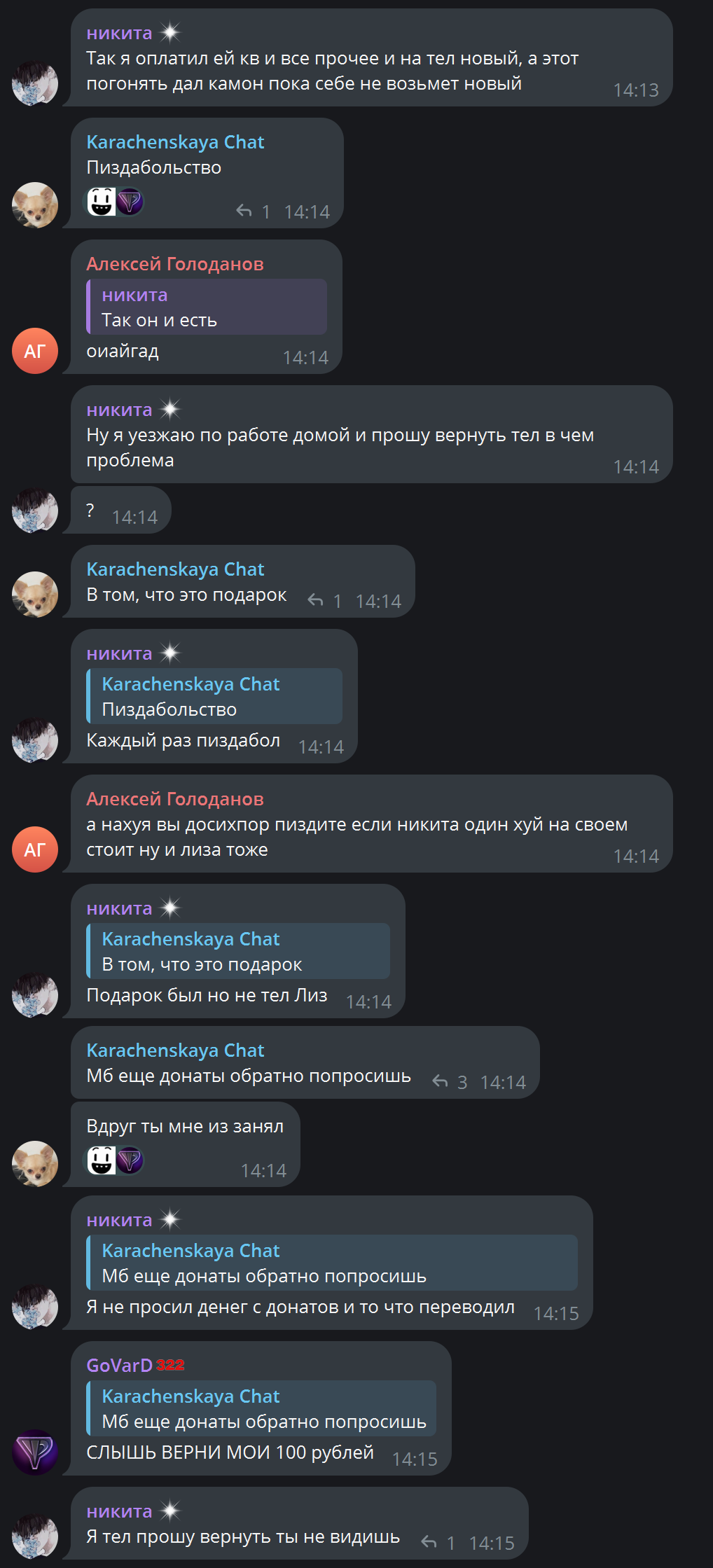 Честно говоря, не ожидал такой подлости от караченской. Конечно, очень смешно это всё, но мне почему-то казалось, что у неё хоть капля совести есть. Даже с учётом того, что у неё развод таких лохов это что-то вроде профессии, казалось бы, у человека с таким ебалом, как у карачки, всё-таки должны быть какие-то моральные установки, которые не позволят уж так беззастенчиво хуесосить лоха, который тебе с нихуя подарки на 1к евро делает. Потому что, если у неё даже этого нет, то что у неё вообще есть?