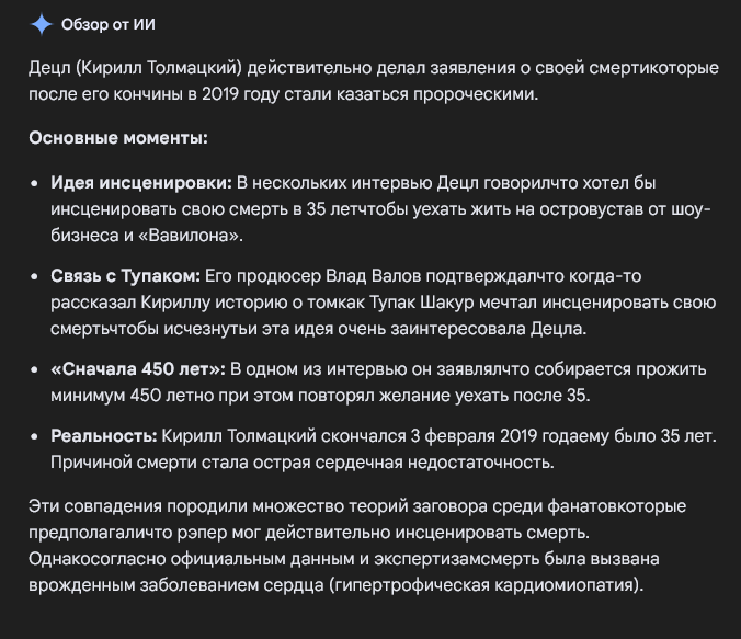 >>330243144 Децл сам об этой инсценировке ещё лет за десять до неё говорил. И неожиданно возраст совпал тютелька в тютельку, ещё и альбомчик посмертный успел подготовить. Наверное надеялся хайпануть как Вайнхаус, а на деле выше жидки letruk в трубы.