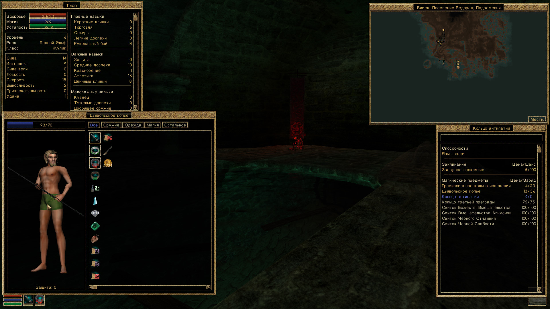 Итак от безысходности я пошел продавать меч в Вивек, никуда не берут, все деньги на учителей спустил, пришлось по помойкам опять ашриться чтоб до Вивека таксист довез. Я негру меч продал, но оказывается я лоханулся сильно, можно было принавыке 0 все равно удачней сделки предлагать и больше б денег иметь. В поселении чужестранце я попытал счастья в канализации, не помню что там, нашел охраняемое святилище культистов и спер пару свитков и дракоценных камней, постоянно перезагружаясь и юзая невидимость, не усто вышло. Зато в поселении Редоран нашел даэдрический кинжал на месте сатанинского ритуала и тоже его негру продал. Типерь надо в Балмору, но в этот раз тратить деньги с умом чтоб быстрее в ступить в любую организацию. Я считаю это должна быть гильдия магов - телепорты удобные + сундук с припасами для бомжей гильдийцев пополняется каждую неделю, при затупах смогу жить и не шариться по помойкам продавая эти припасы.