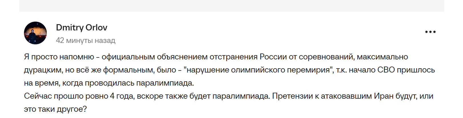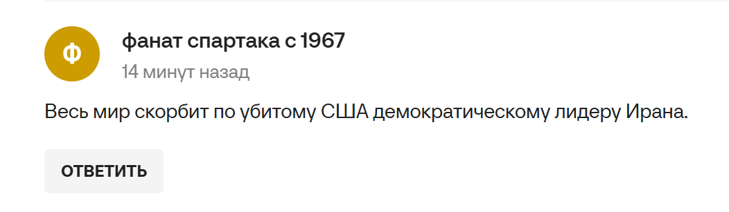 >а как дело дошло до зарубы, сфидил как последний лошара в первый же день Ну на самом деле нет, он готов был помереть, потому что лютым фанатиком был. Он ещё в ырано-ыракскую воевал, получал ранения. Далее было много заруб у него с Израилем и США с 1989 по 2026 год, и он их всех переживал. А вот эту не пережил уже, вот и всё. Ну закономерный итог любого бандитского диктатора, расстрелявшего 30 000 собственных граждан во время протестов.