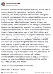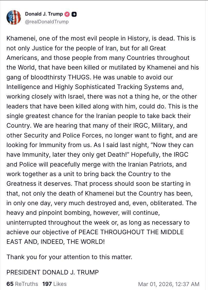 Хаменеи, один из самых злых людей в истории, мертв. Это не только справедливость для народа Ирана, но и для всех великих американцев и тех людей из многих стран мира, которые были убиты или изувечены Хаменеи и его бандой кровожадных головорезов. Он не смог избежать нашей разведки и высокотехнологичных систем слежения, и, тесно сотрудничая с Израилем, он или другие лидеры, убитые вместе с ним, ничего не могли сделать. Это единственный и самый большой шанс для иранского народа вернуть свою страну. Мы слышим, что многие из их КСИР, военных и других сил безопасности и полиции больше не хотят воевать и ищут от нас иммунитета.