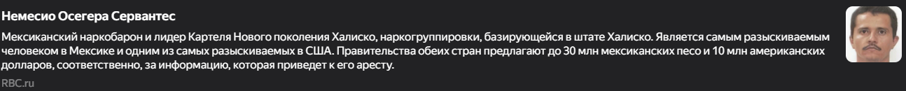 >>61987714 Глава картеля. Амеры третьего дня прилетели на вертолётике и его ёбнули. У картельских от этого сгорела жопа и они стали поджигать всё в Мексике и похищать амерских туристов.
