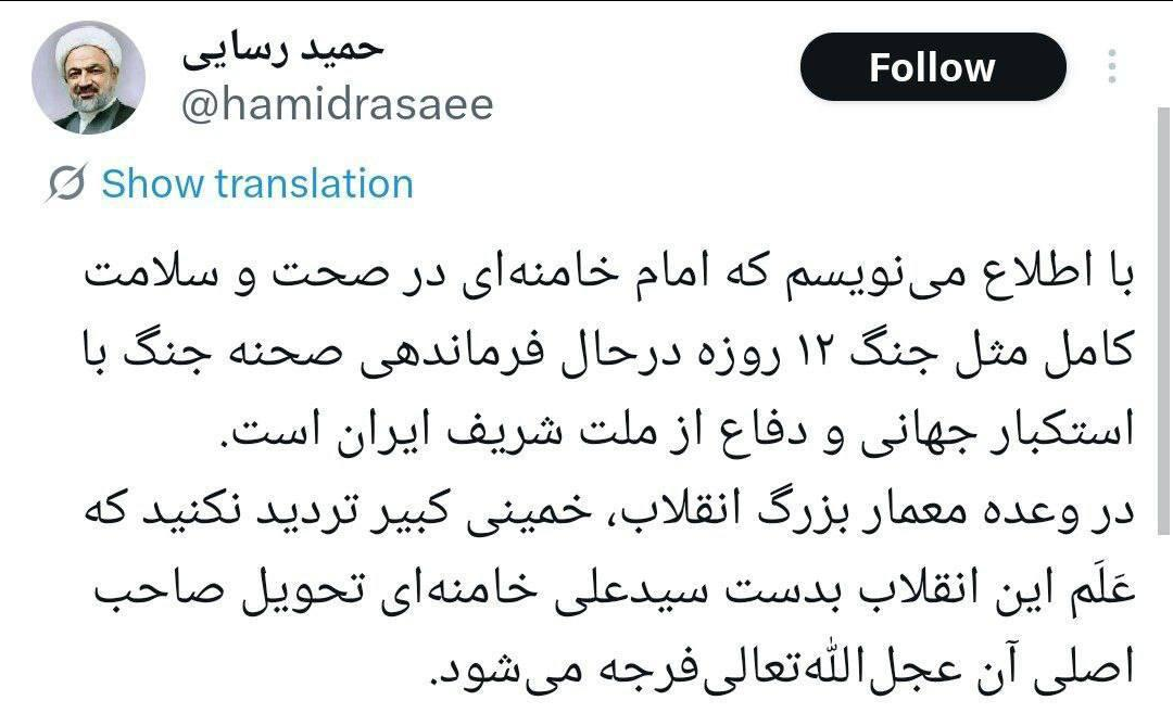 Член парламента Хамид Расаи заявил: «С удовольствием сообщаю, что имам Хаменеи находится в полном здравии». Также телеканал Sky News со ссылкой на МИД Ирана сообщает, что Хаменеи «твёрд и решительно командует на месте».