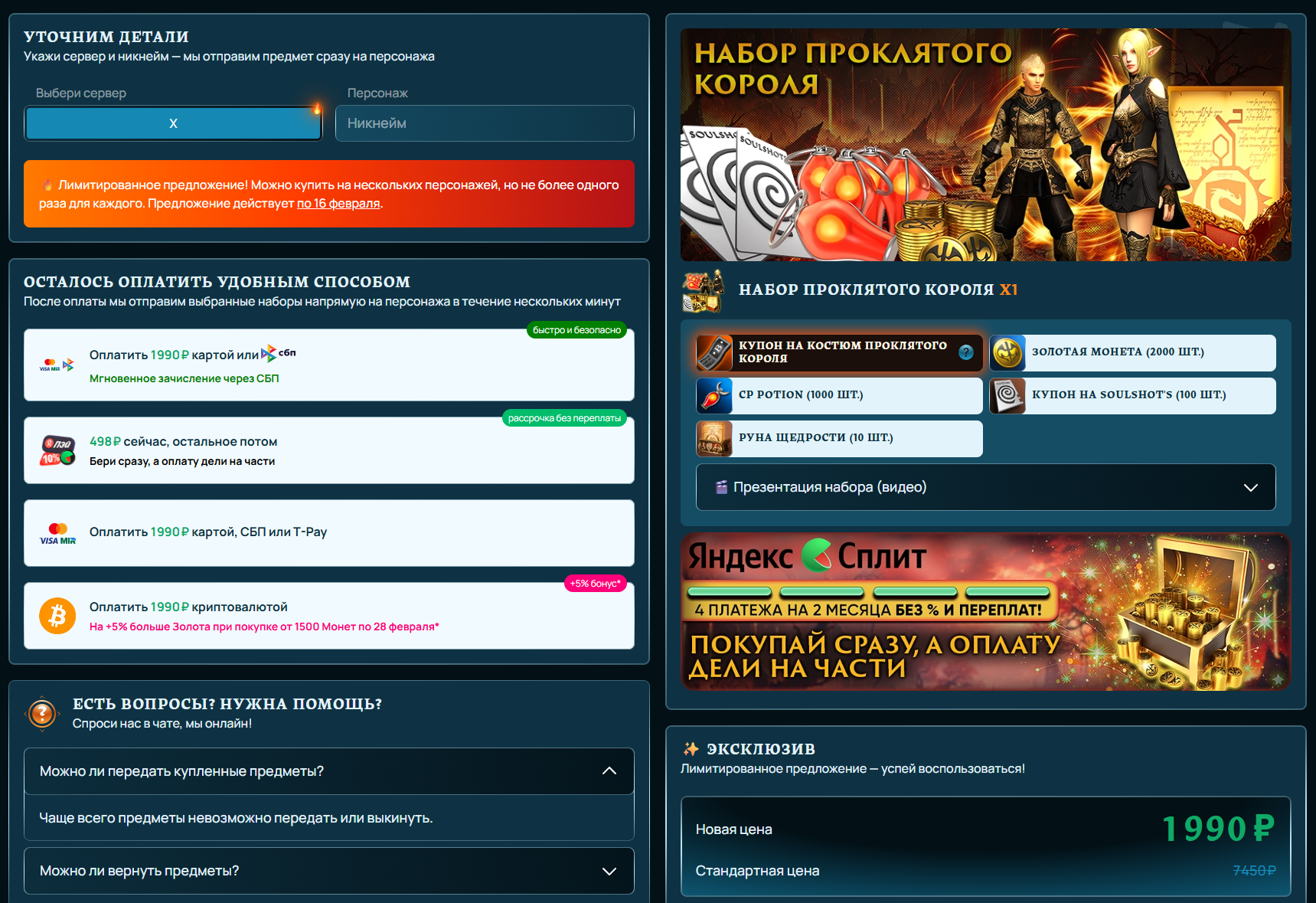 >>50765384 Еще можешь купить набор проклятого короля за 1990 рублей и бегать в уникальном сете. Яндекс-рассрочка если что поможет оплатить частями, без переплат.
