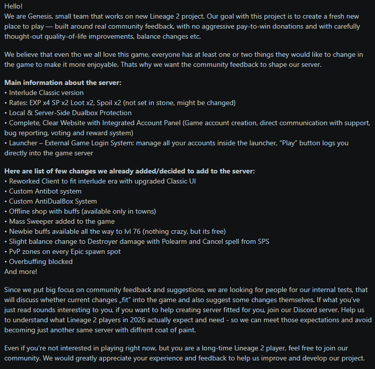 ♿ Кооперация и свежие обзоры серверов с анонами: https://github.com/lineage2thread/lineage2/blob/main/cooperation.md