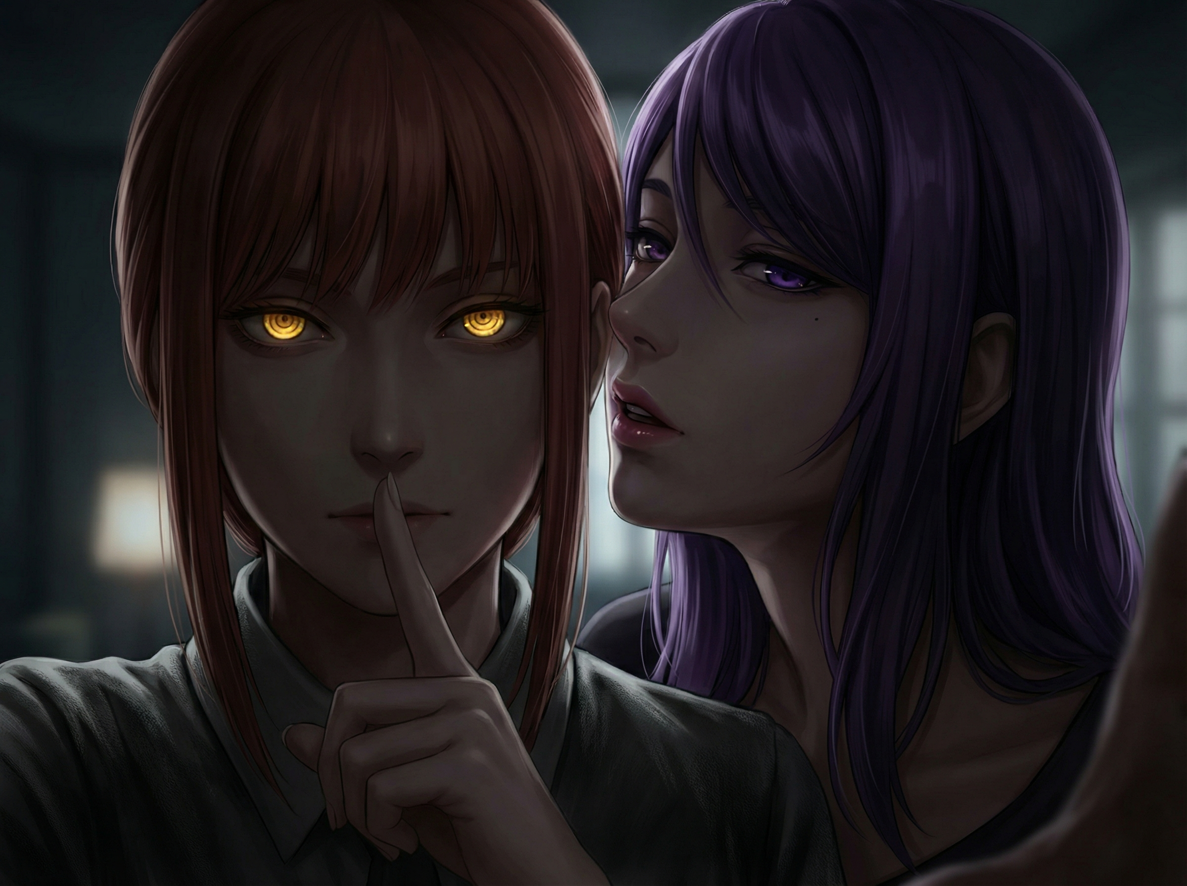 POV, персонаж1 and персонаж2 are looking away from each other, персонаж1 is facing the viewer and puckering her lips, персонаж2 is facing the viewer and puckering her lips, extreme close up, eye contact, lips focus, semi-realistic anime style