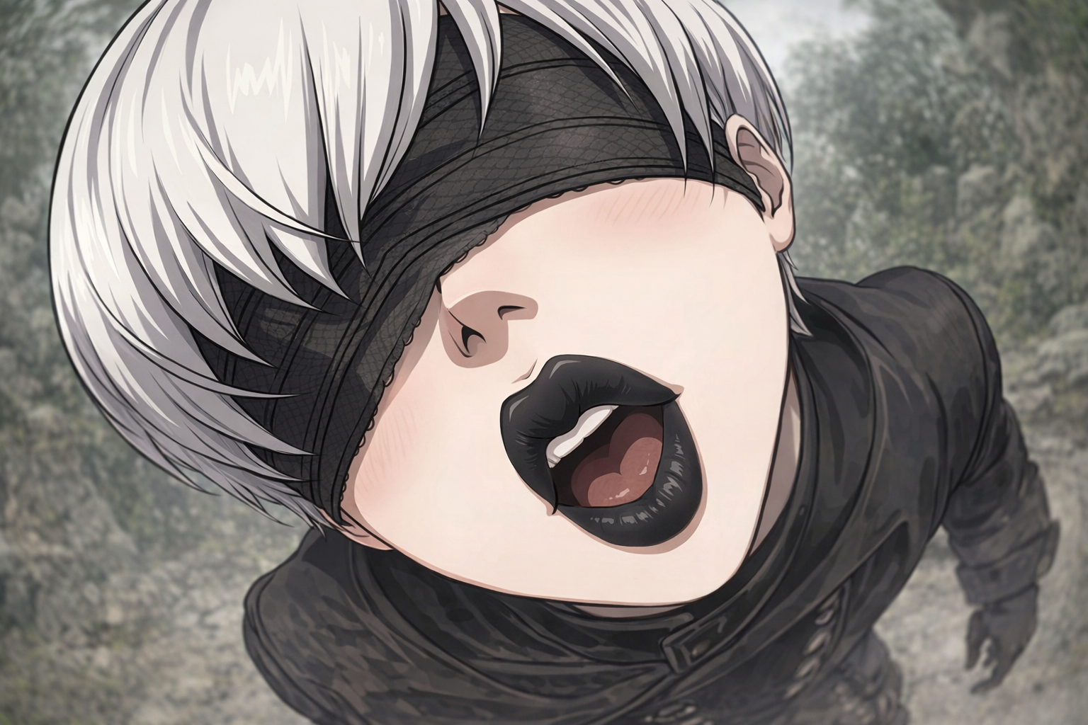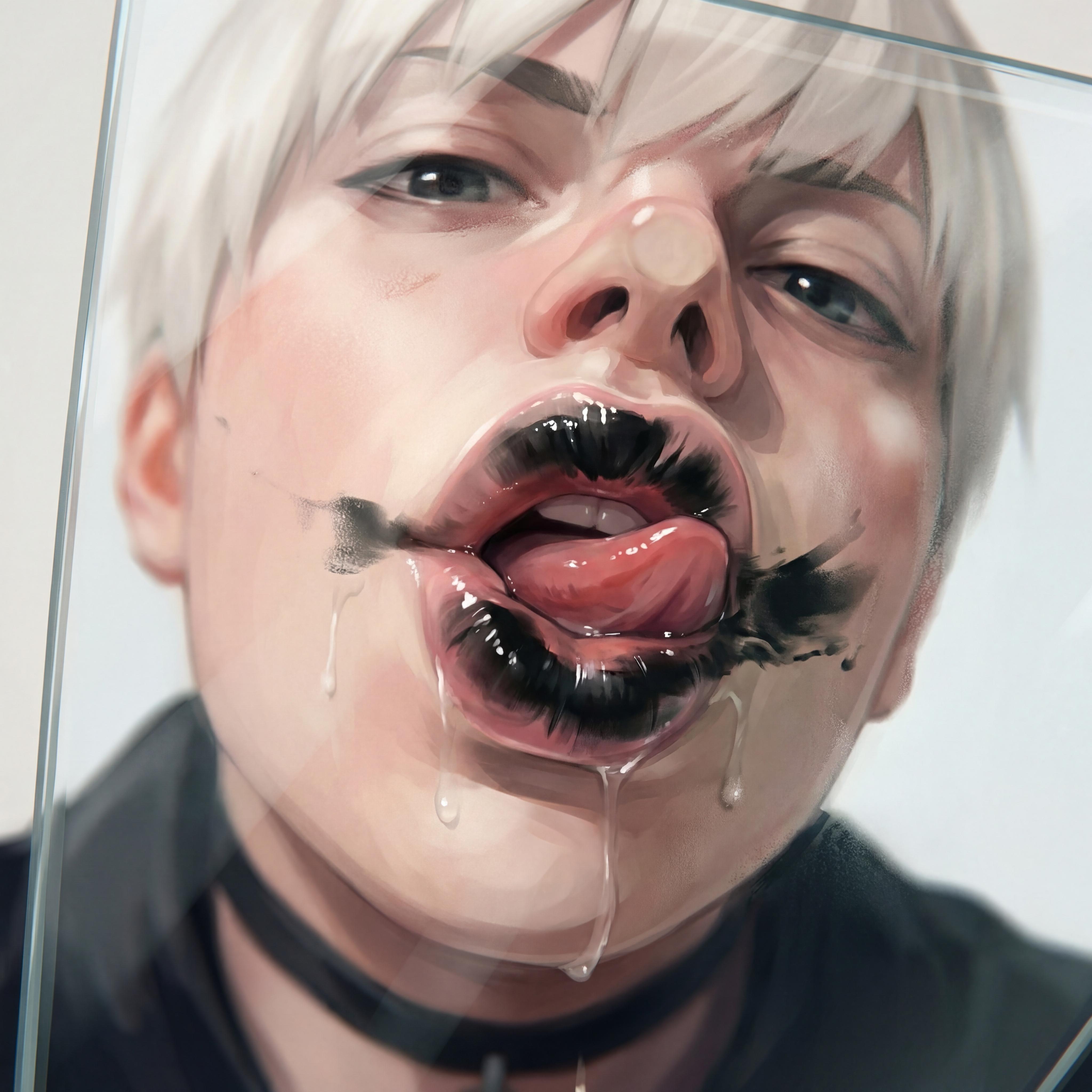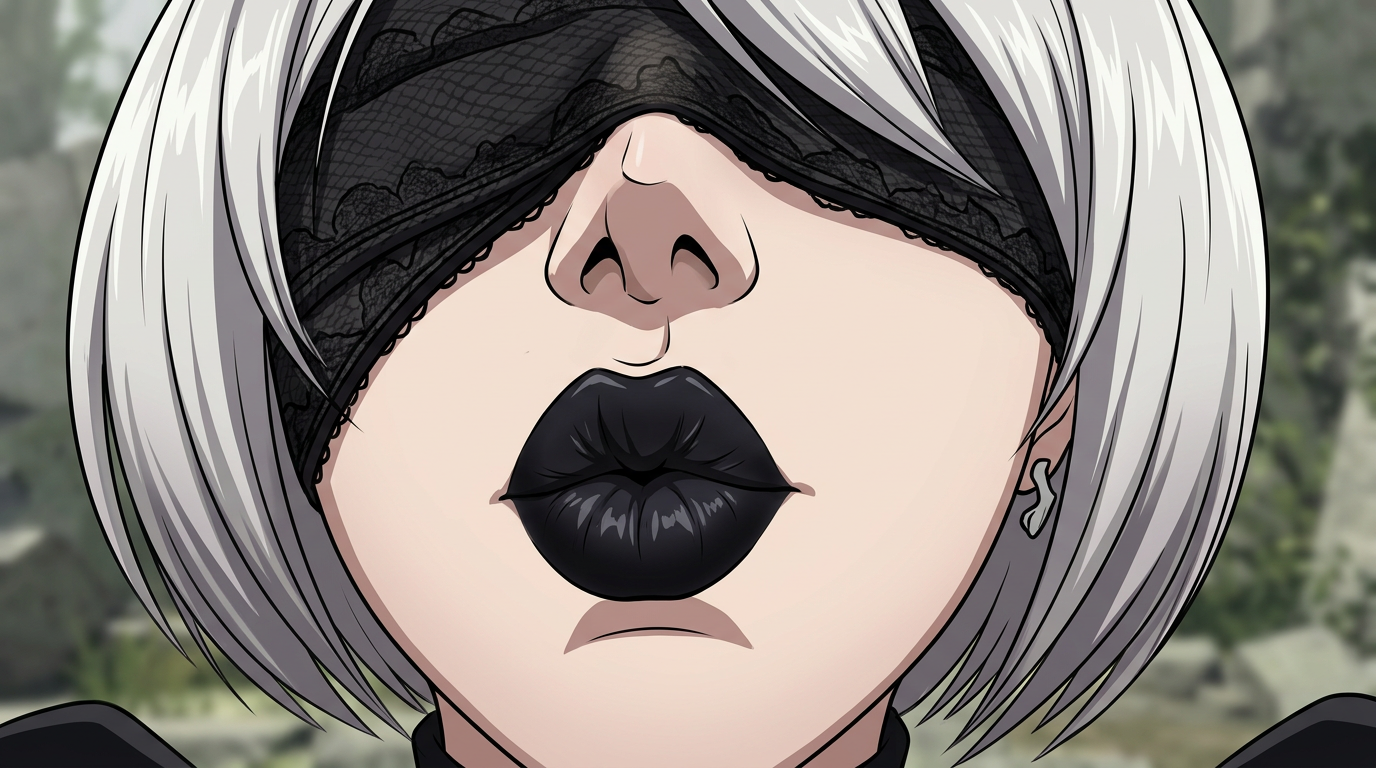 >>330304251 Extreme close-up shot of an 9s and 2b from Nier: Automata pressing their lips firmly against the camera lens, mouth lips fully flattened and distorted against glass, visible moisture and compression marks, exaggerated perspective, fisheye lens (8mm lens), mouth dominating the entire frame, nose partially visible at top edge, cheeks compressed, skin pressed against glass surface, glossy lipstick, high detail skin texture, studio lighting, dark blurred background, viewer POV perspective, cinematic lighting, shallow depth of field, lens reflections, subtle glass smudges, macro photography, dramatic perspective distortion, mouth lips visibly squished and spread against glass, inner lip texture slightly visible through pressure, suction effect, realistic skin deformation, slight fogging on glass from breath, playful exaggerated kiss pose. lips pout while lips are flattened against the glass. anime illustration style.