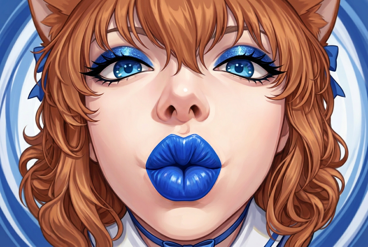 Generate имя in this pose, close up, extreme fish eye distortion effect, eye contact, blue lipstick, make up, blue eye shadow, black eyeliner, anime style, squish, anime style