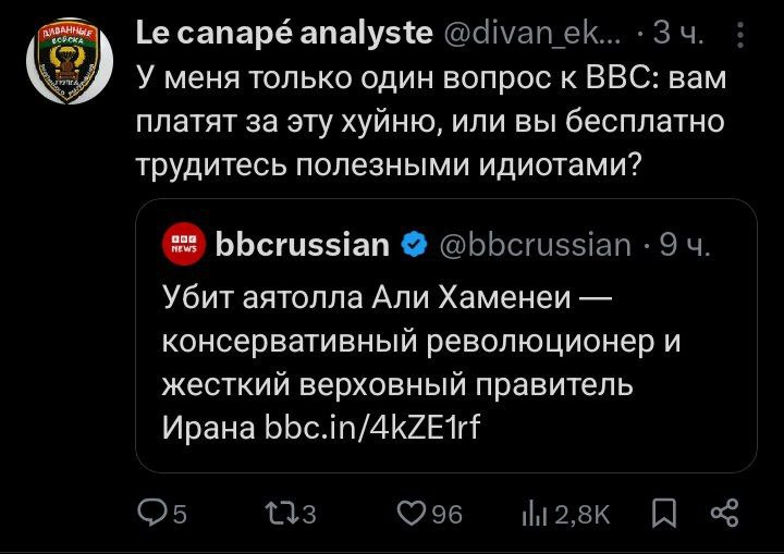 Как жаль, что сейчас царит полнейшая цензура и нихуя не понятно. В Иране интернет отрублен, а жиды контрят, но вчера вроде бы Линкольн потопили, сегодня гуляет новость про подбитый кораблик США у берегов жидзраиля, Хаменеи убили еще вчера утром, а ракеты как летали, так и летают, народ в Иране не бунтует... Победа запада только текстом, что вызывает мысли, что трап там не хило посасывает с этой авантюрой.