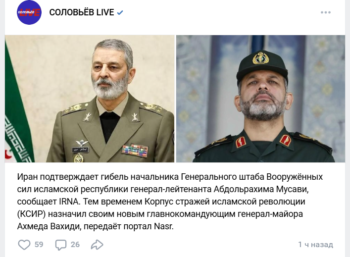 Информация об авиаударе по Иранской телерадиовещательной корпорации опровергнута 🔹 Генеральный директор по связям с общественностью Иранской телерадиовещательной корпорации опроверг опубликованную информацию об авиаударе по организации.